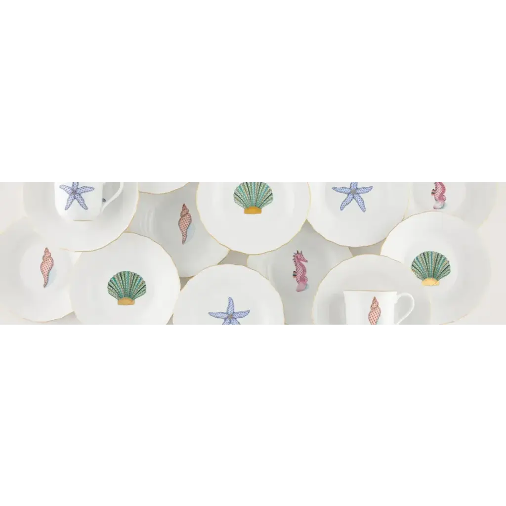 It was only a matter of time before Herend's figurines finally crossed over to dinnerware. The new Aquatic collection features four different motifs: a raspberry seahorse, a rust tulip shell, a green scallop shell and a blue starfish. Hand painted in Hungary. Now the biggest porcelain manufactory in Europe, Herend was founded in 1826 to produce earthenware in the small Hungarian village for which it was named. At the time, Hungary was flooded with low-cost pottery, but in 1839, Mor Fischer became the Manufactory’s new owner and he decided to focus on producing dinnerware replacement pieces for Europe’s royal families to complement their valuable porcelain patterns from Germany and the Far East. As his client base grew, Fischer commissioned his artists to begin designing dinnerware patterns of their own. Queen Victoria’s 1851 purchase of a large set for Windsor Castle was a milestone, setting the stage for aristocrats throughout Europe to clamor for Herend in their estates. In the 1850s, Herend added meticulously-crafted figurines to its creations. Herend’s trademark fishnet pattern, which is widely recognized and prized as Herend’s signature design, started in 1858 when an artist who was intrigued with a Chinese plate’s fish scale design painted it onto a rooster figurine to imitate feathers.