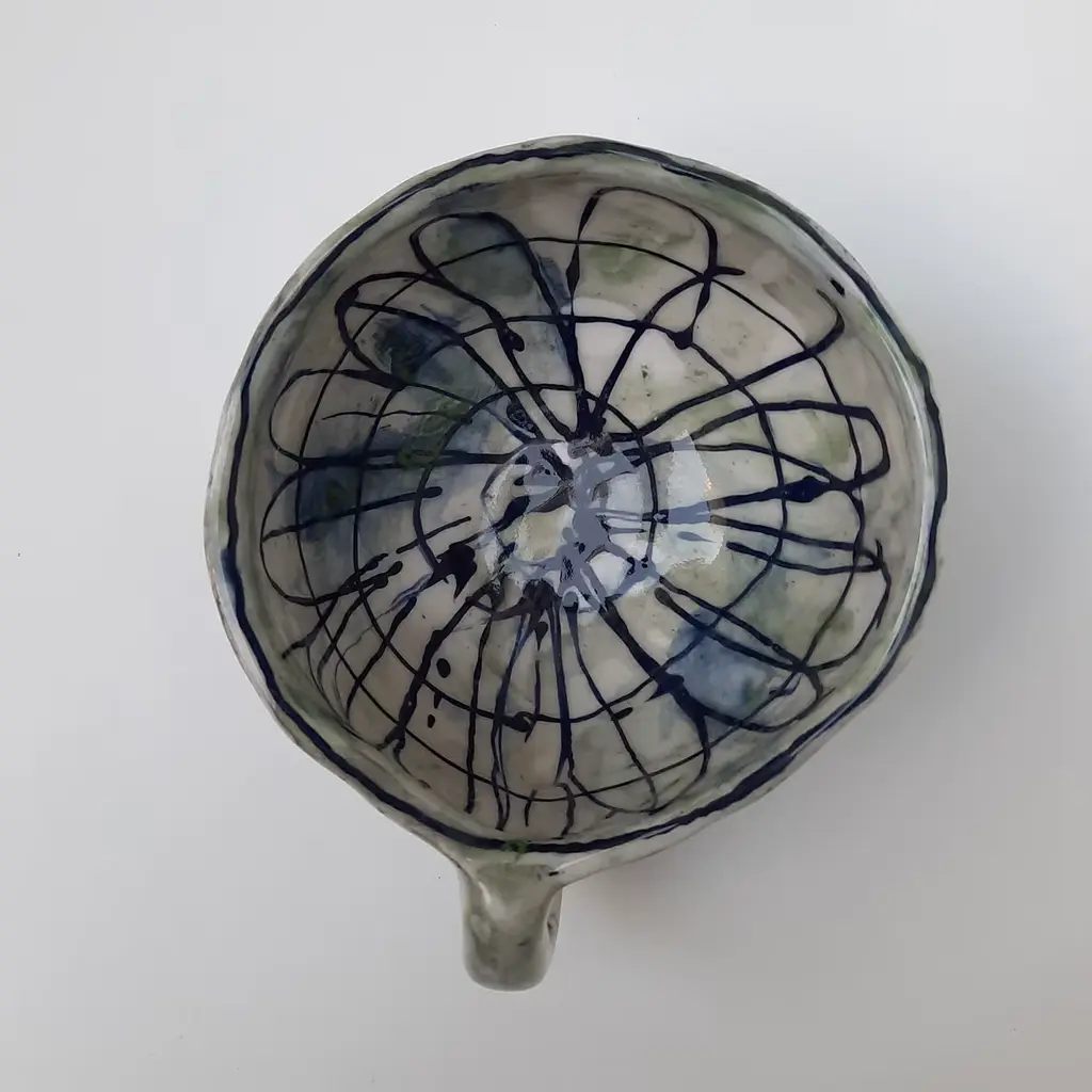 Shades of gray, blue, and green subtly merge under the transparent glaze of this teacup, singular piece handcrafted of ceramic to give a distinctive tone to tea-time breaks. Geometric lines and petals seemingly intertwine along the inside of the cup, traced by irregular black lines whose pattern can be fully admired when taking the last sip of tea. Transparent glaze emphasizes its irregularities and hues.