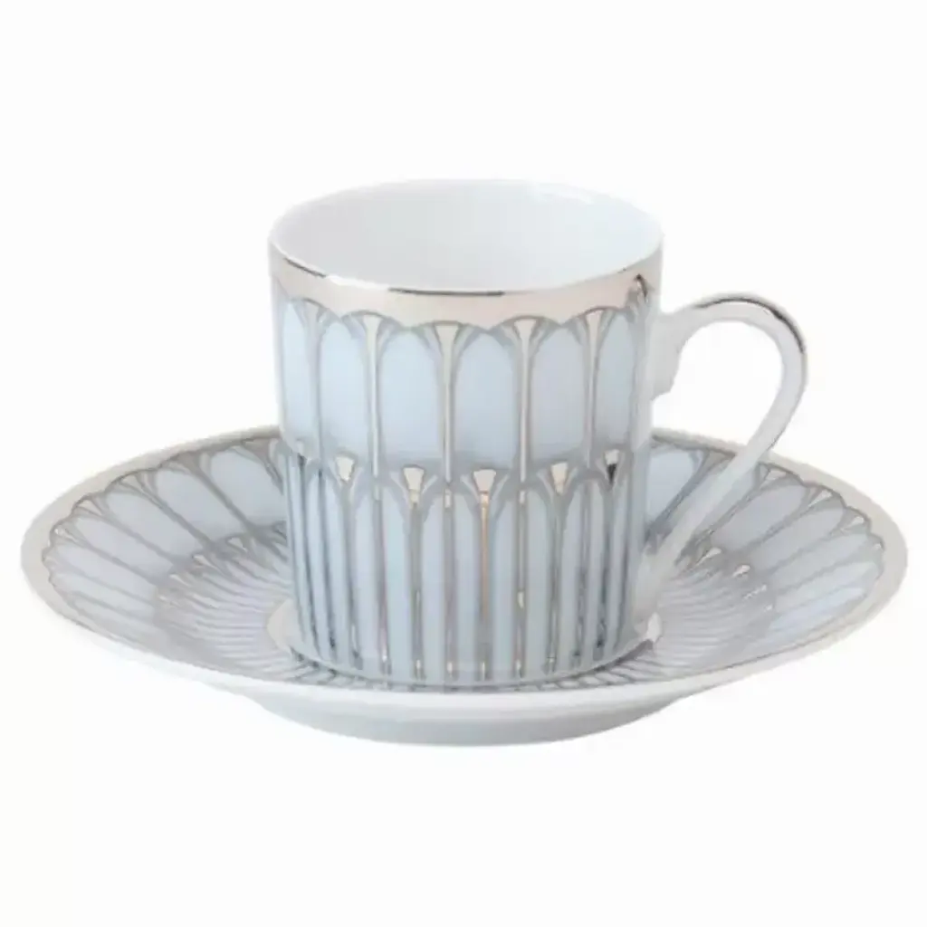 Shades of grey and matte gold combine to evoke the Florentine palaces and colonnades of their processions. Five piece place setting includes dinner plate, dessert plate, bread & butter plate, teacup and saucer. France. Limoges Porcelain. Dishwasher Safe; Not Microwave Safe. Founded in 1826, Deshoulières is the leading French porcelain maker today. Their fine white Limoges porcelain is strong enough for everyday use. Their style is well known around the world. The painters and decorators have generations of knowledge. Inspired by trends from both interiors and fashion, their patterns are always refined. Deshoulières embodies a true spirit of French style. With their new collections, Deshoulières delights everyone from homeowners to professional chefs. Invite elegance to your table with Deshoulières.