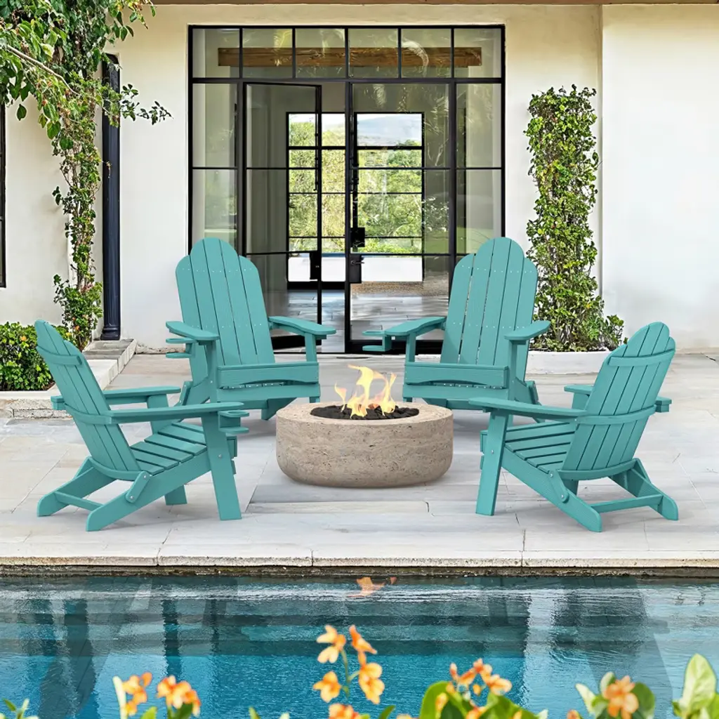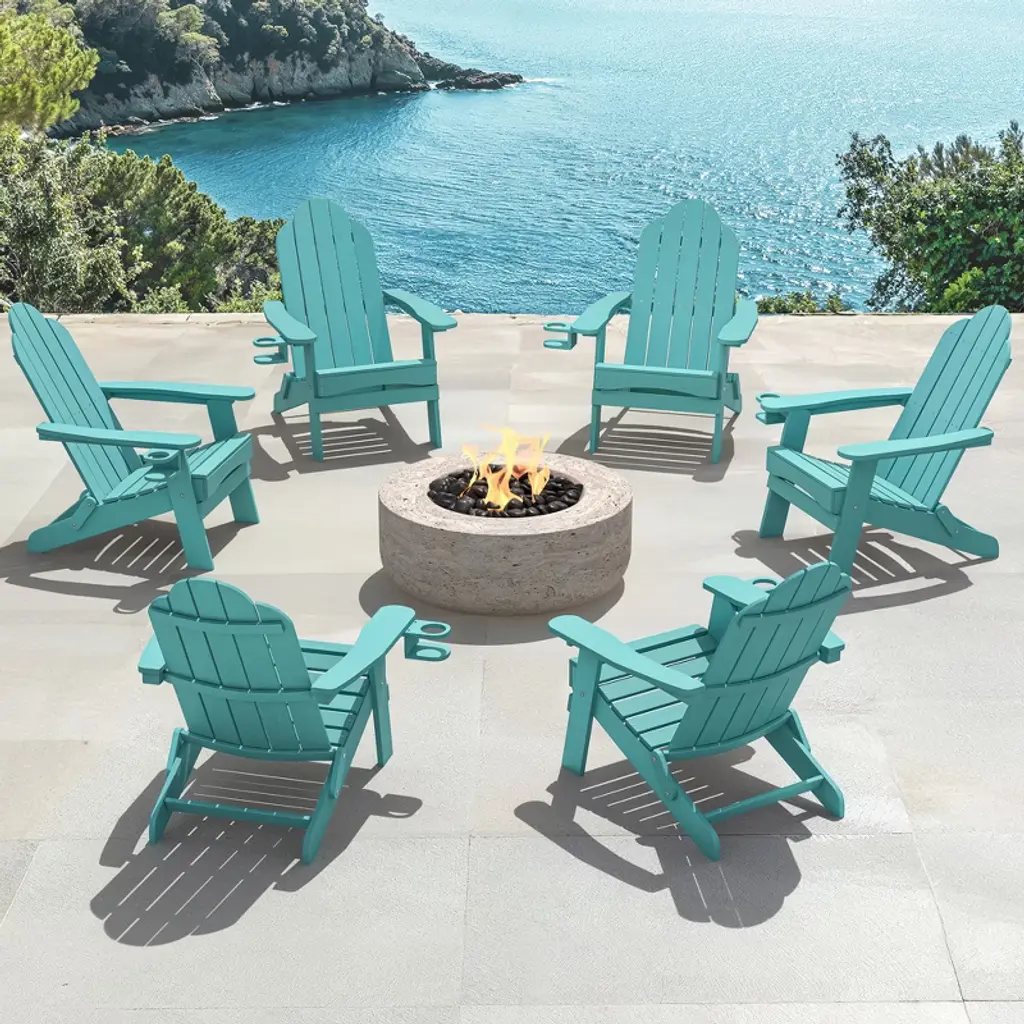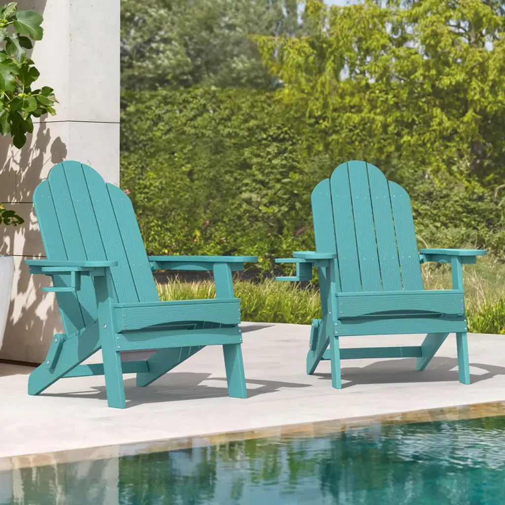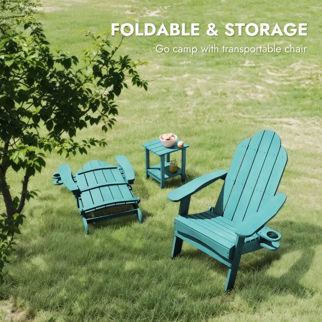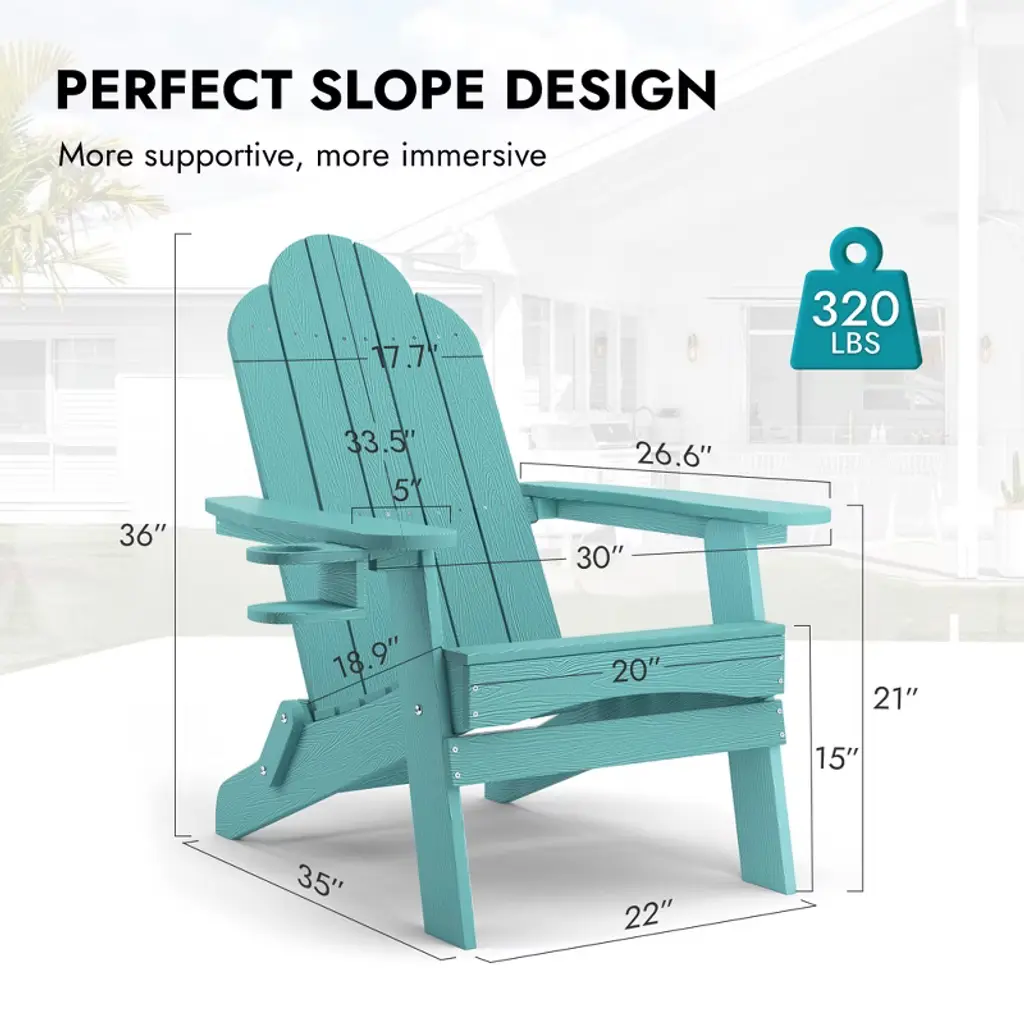 Folding Adirondack Chair: This chair easily folds for convenient storage, saving space in your home and making it perfect for travel or day trips. You can also store it in a shed during the winter months. Sturdy Construction: Crafted from HDPS, these Adirondack lounge chairs offer a robust structure that is highly durable and resistant to breakage. The solid construction ensures easy entry and exit, with a maximum weight capacity of 320 lbs. Weather-Resistant: Designed for outdoor use, these chairs are UV-protected, sun-resistant, quick-drying, and easy to clean. The clapboard-style design helps to keep the seat dry even in rainy or wet conditions. Rotatable Hidden Cup Holder: A hidden cup holder is discreetly located under the armrest, easily accessible when needed. It can be installed on either side of the chair, with a double protective design to securely hold cups and prevent spills. Comfortable Seating: The folding Adirondack chair features a signature tilted seat and a curved backrest with a 103-degree angle, offering excellent support and reducing pressure on the lower back and knees.