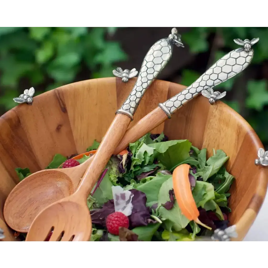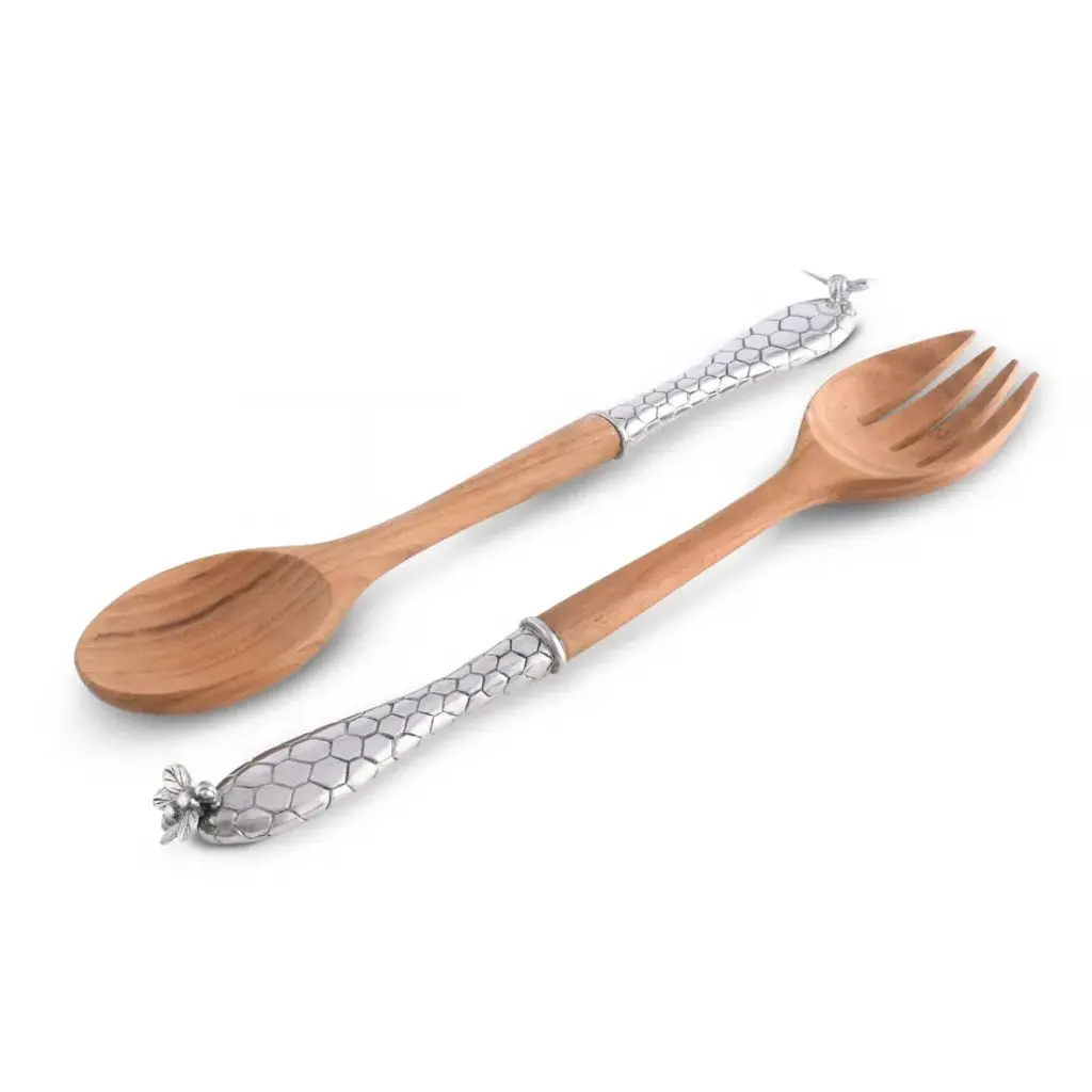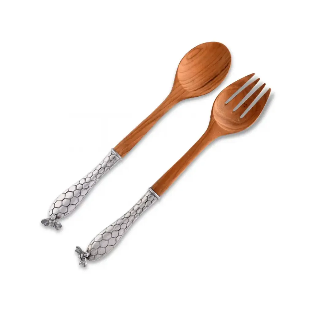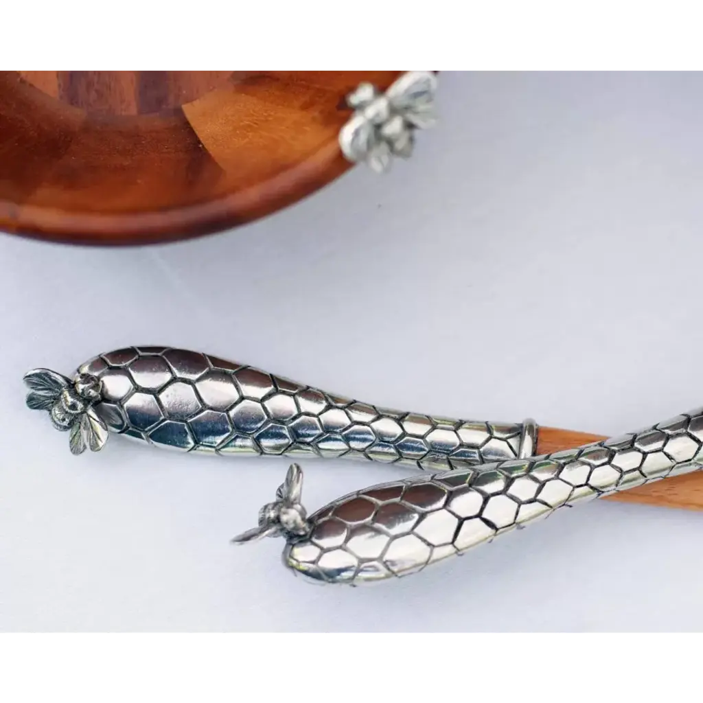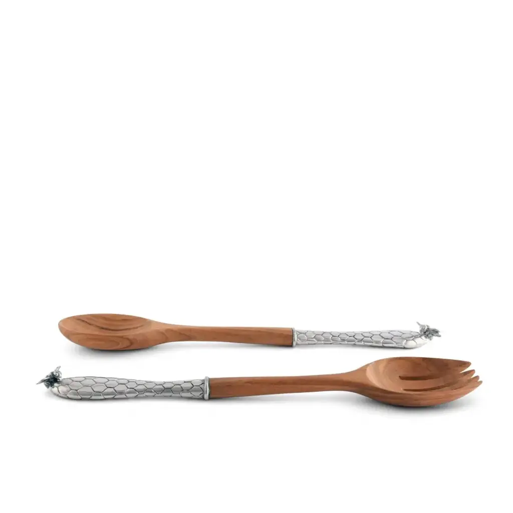 Small, realistic bees tend to their pure-pewter honeycomb as it stretches up the handle of this Vagabond House Salad Server Set. Crafted from acacia, the wooden heads accentuate the definition within these hexagonal cells, while the insects also show striking realism in their exquisite forms. Vagabond House is a family-owned American company specializing in fine pewter tableware, servingware and giftware. Largely inspired by nature, their exclusive products are designed to be unique, functional heirlooms for those who seek to express tradition and style in both family and formal entertaining.
