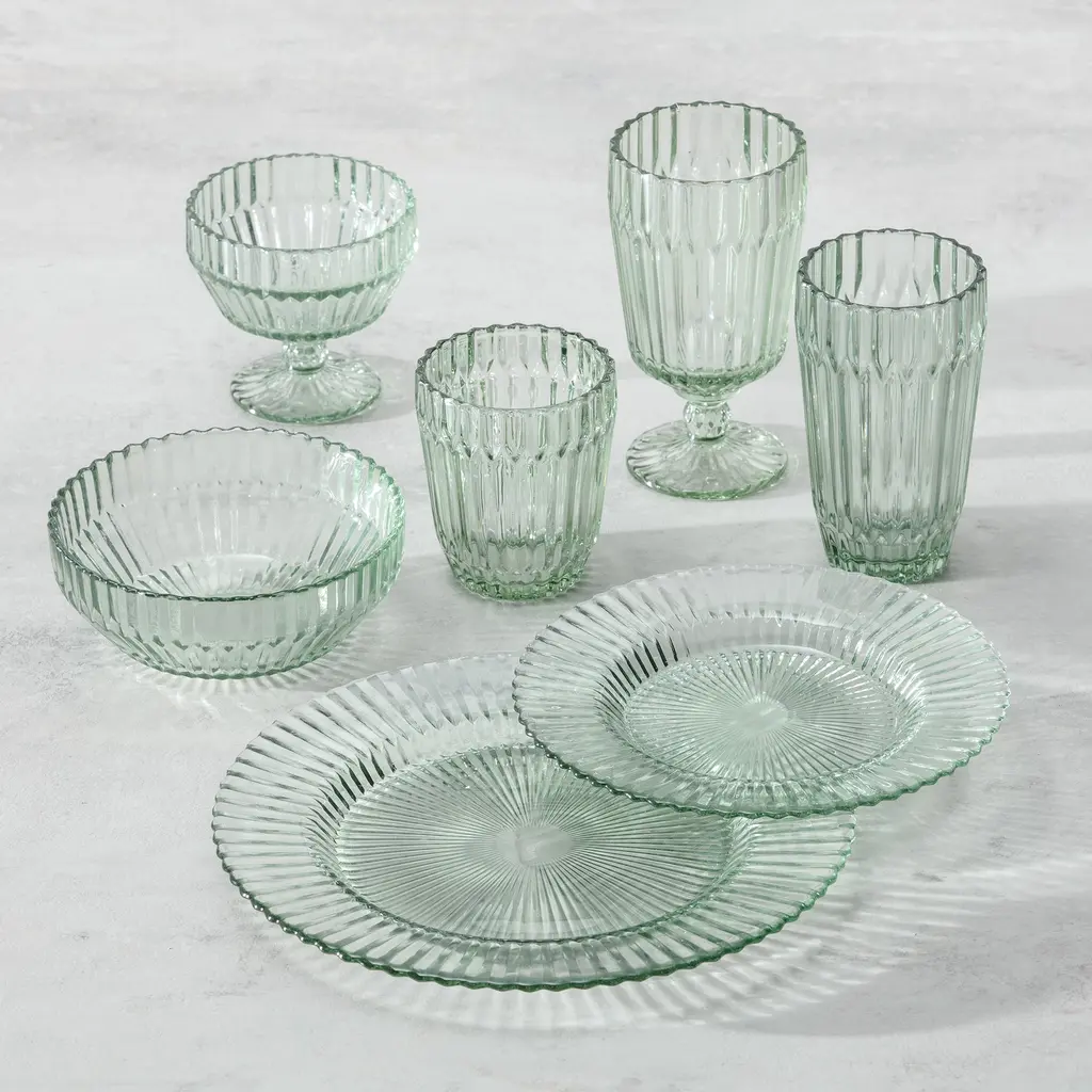 Inspired by the gothic architecture found in the western Sardinian city of Alghero, Fortressa's Archie blends color, light and structured form in a beautiful glass dinnerware collection. The molded facets put a tactile heft in the hand and refract the light, creating dramatic shadow play. Made of soda-lime-silica with magnesium oxide and alumina for durability, Fortessa Glass adds shine and texture to today's tablescapes.
