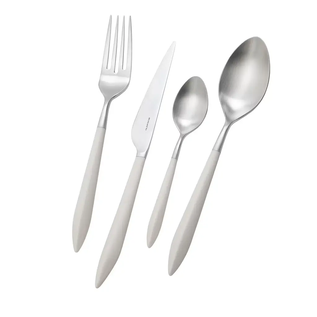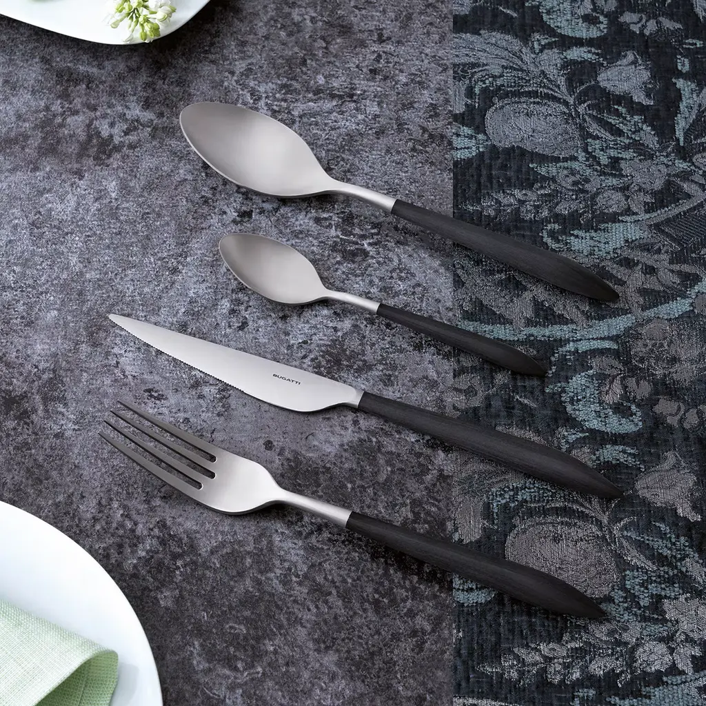 Modern and elegant, this 24-piece set will add a unique touch to any table setting, from formal to casual. Including 6 tablespoons (L 21.5cm), 6 table forks (L 21.5cm), 6 table knives (L 23.5cm), and 6 teaspoons (L 15.3cm), each piece is crafted of 18/10 stainless steel and has a tapered black Bakerlite effect handle (available also in other colors upon request). The set comes ready to be gifted in a wengé-finished wooden case.