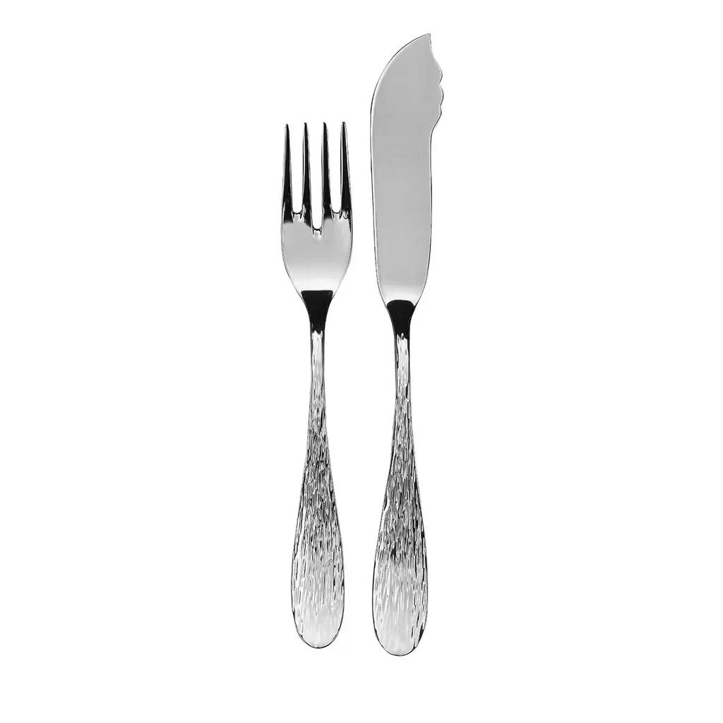 Evoking the elegance of traditional cutlery with modern flair, this exceptional set will distinguish any silverware collection. This 12-piece set is comprised of six pairs of forks and knives with a hammered handle with delicate bumps evoking the dynamism of air. The texture of the handle elegantly contrasts with the polished knife and fork ends, resulting in a singular textural contrast. Sleek and functional, this set is plated in silver using PVD for superior resistance to corrosion.
