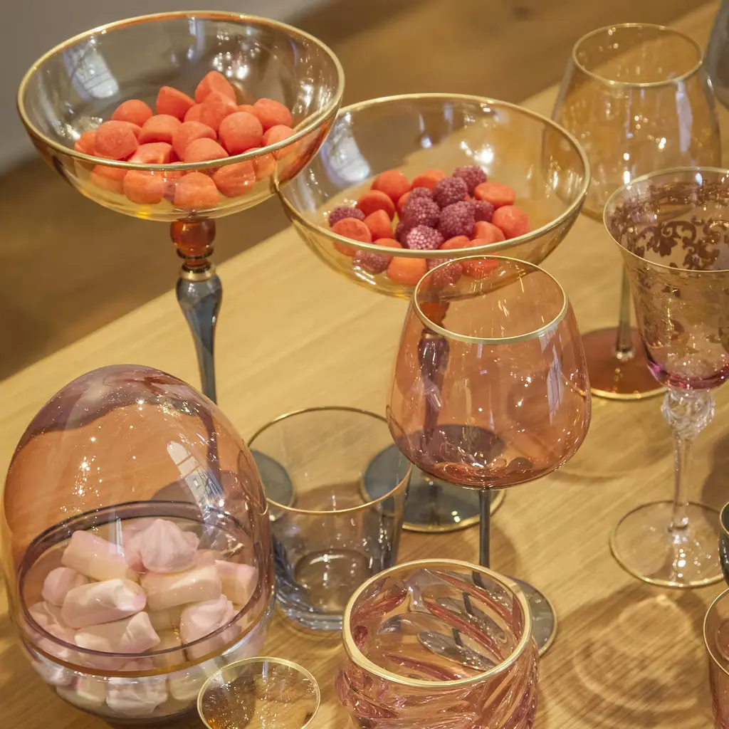 This exquisite cup made entirely in glass according to artisanal methods is distinctive for its long, elegant stem and the delicate colors that adorn it, all applied by hand. A pale blue base supports the blue and red stem, while a delicate shade of amber graces the curves of the cup above. Pure gold details add a warm glow to this precious piece that can be used as a charming centerpiece to add elegance and color to any decor.