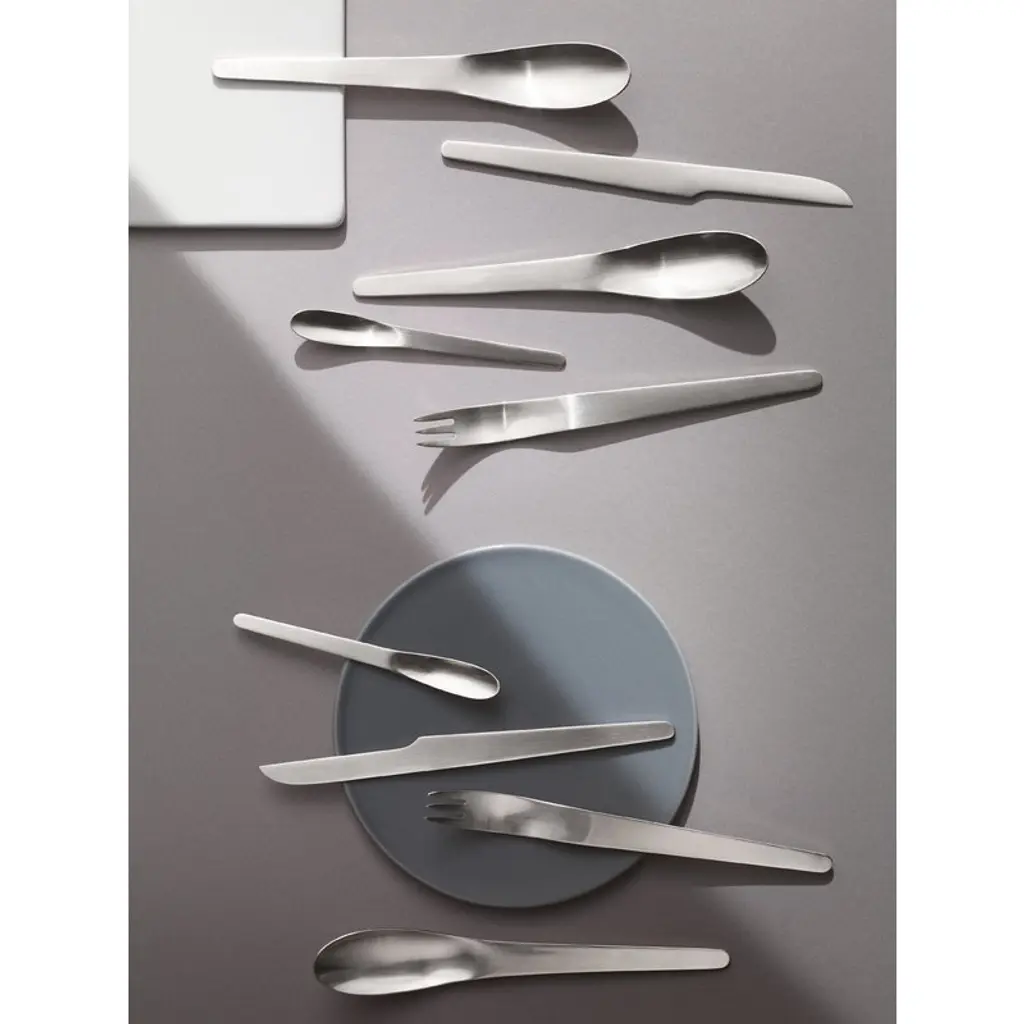 Master craftsman Arne Jacobsen revolutionized cutlery with his modern design. Originally designed for the SAS Royal Hotel in Copenhagen in 1957, the pieces of the Arne Jacobsen cutlery set feel as contemporary today as they did when they first debuted. The cutlery is comfortable to hold and nicely balanced, and the matte stainless steel lends elegance to any table setting. This collection has been called "cutlery without frills" because it is the sophisticated design that makes it stand out rather than a pattern or additional adornment. Arne Jacobsen cutlery set contains six each of the dinner spoon, dinner fork, long grill dinner knife and tea spoon.