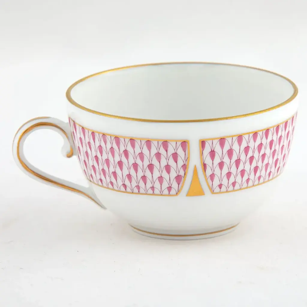 Herend fishnet lovers can rejoice since their favorite design has made the leap to dinnerware. The Art Deco pattern combines the fishnet motif with geometric inflection points in 24K gold which add dramatic pops of interest. Together, these two styles contribute a captivatingly modern composition to the Herend oeuvre. Handpainted in Hungary. Now the biggest porcelain manufactory in Europe, Herend was founded in 1826 to produce earthenware in the small Hungarian village for which it was named. At the time, Hungary was flooded with low-cost pottery, but in 1839, Mor Fischer became the Manufactory’s new owner and he decided to focus on producing dinnerware replacement pieces for Europe’s royal families to complement their valuable porcelain patterns from Germany and the Far East. As his client base grew, Fischer commissioned his artists to begin designing dinnerware patterns of their own. Queen Victoria’s 1851 purchase of a large set for Windsor Castle was a milestone, setting the stage for aristocrats throughout Europe to clamor for Herend in their estates. In the 1850s, Herend added meticulously-crafted figurines to its creations. Herend’s trademark fishnet pattern, which is widely recognized and prized as Herend’s signature design, started in 1858 when an artist who was intrigued with a Chinese plate’s fish scale design painted it onto a rooster figurine to imitate feathers.