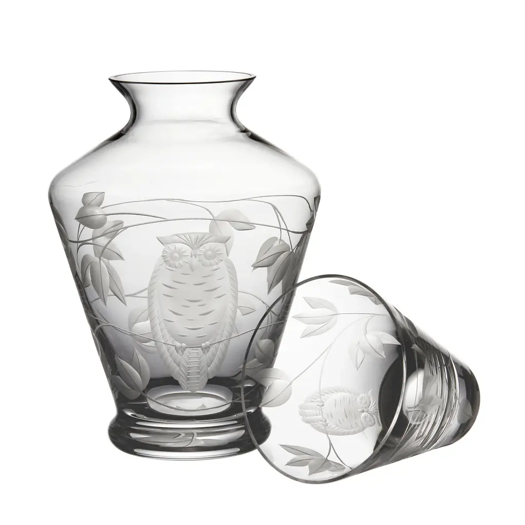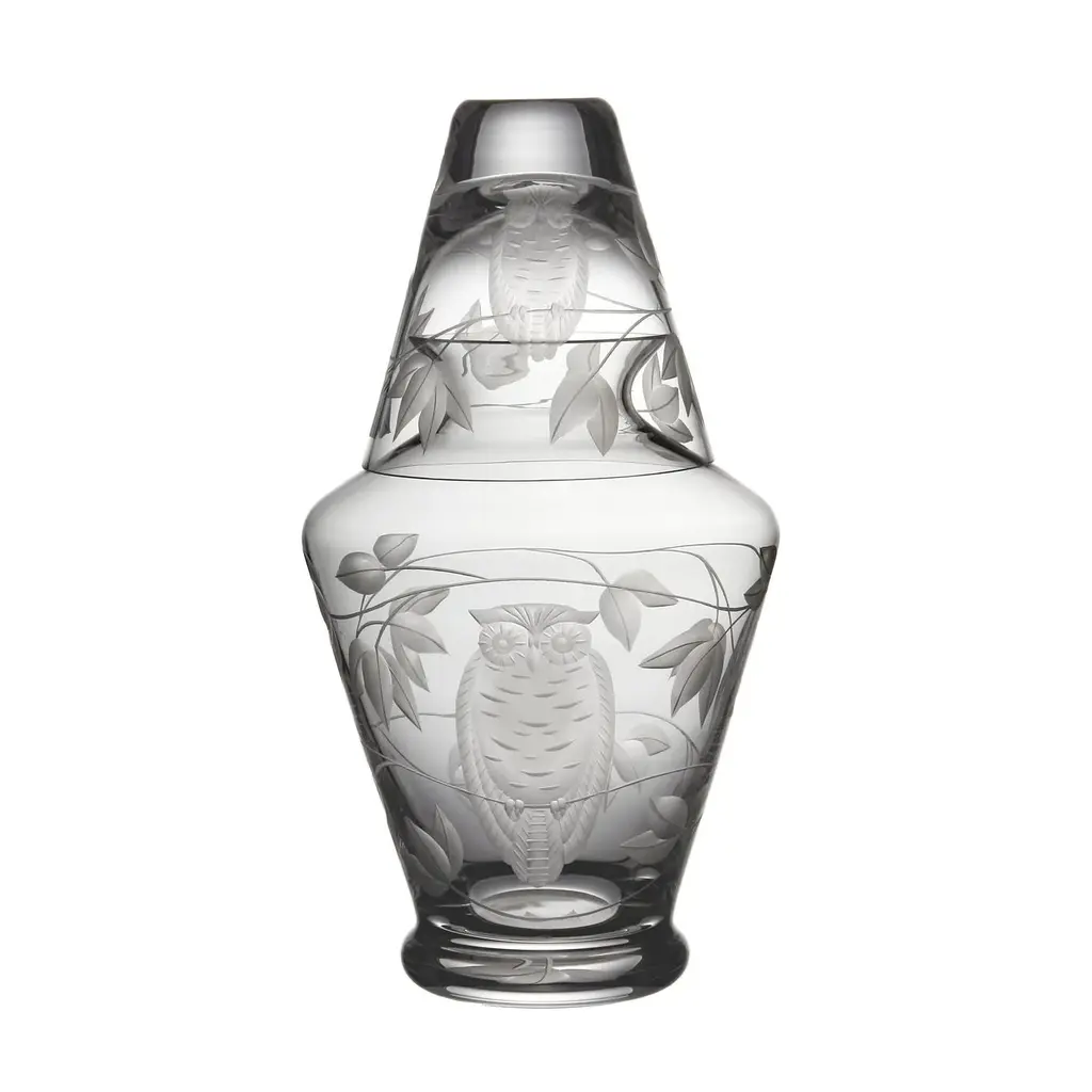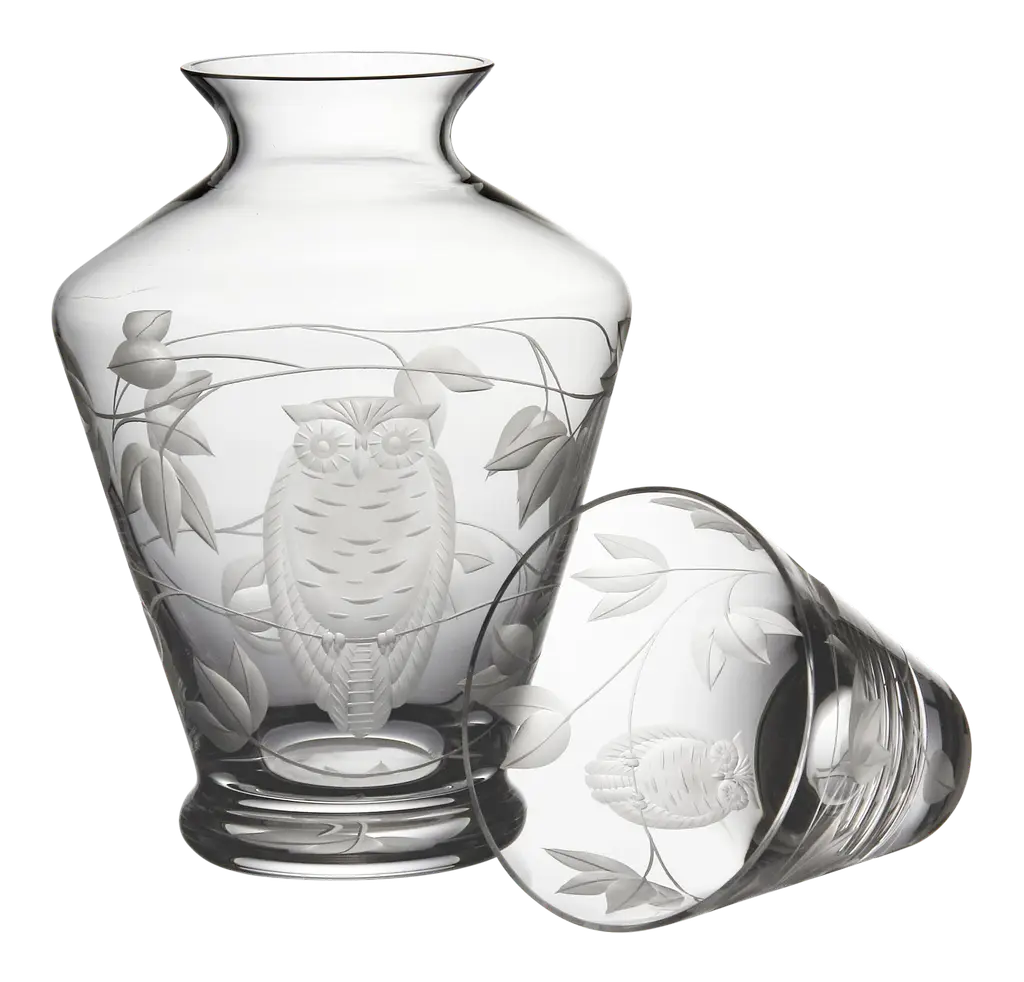 Looking for a different color or set quantity? ARTEL crystal glassware is available in over 30 beautiful colors, which can be applied to most motifs. For more information on customization options, please reach out to custom@chairish.com. Lead time for all ARTEL glassware is 9-12 weeks as each piece is made to order and handmade, just for you. On NIGHT OWL a lone wise owl, perched on a delicate branch, peers silently into the darkness. Each owl is hand-engraved in rich detail by Czech artisans, and no two are exactly alike. The Bedside Decanter is a stylish way to keep fresh water (or other refreshments) on the nightstand, it features an innovative lid that doubles as a drinking glass. DECANTER Dimensions are 5.5" H x 4" W; 15.2 oz GLASS Dimensions are 3" H x 3" W; 3.4 oz CARE INSTRUCTIONS: Product care should be followed to ensure that your glass retains its quality for many years and generations to come. • Not recommended for the dishwasher. • Hand wash immediately after use with a soft sponge, mild soap and warm water. • Dry immediately with a soft cloth to avoid spots. • Do not soak, even in plain water, or leave unwashed overnight. • Avoid any detergent or mild soap with lemon or other acidic agents. • Do not use abrasive cleaners, steel wool or scouring pads that can scratch the glass.