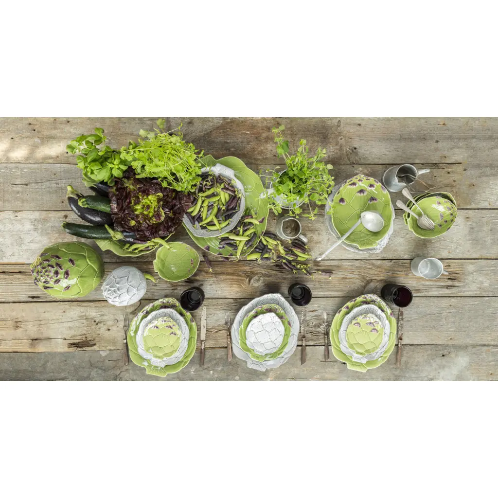 Continuing the development of the current range of vegetables, while maintaining the brand's historical identity, Artichoke presents entirely new utilitarian and decorative models. The DNA of Bordallo Pinheiro is present in meticulous attention to detail, both in the shaping of forms and texture, and in manual painting of the most faithfully naturalistic style. It coexists with the rustic white, in a versatile and contemporary set, allowing a very original mix and match. Portugal's most beloved cartoonist of the 19th century, Bordallo Pinheiro was famous for creating the character "Ze Povinho," a rustic laborer who was kind to his friends and contemptuous of those with money and power. His artistic style blends the honesty realism of late 19th-century Arts and Crafts movement with the dramatic, even grotesque, features of Goya's earlier paintings. In 1884, he and his son founded an eponymous factory in Caldas da Rainha along the Portuguese coast to create whimsical and naturalistic faience pieces based on his art. Because of the special minerals in the local soil and the skills of the craftsmen in the area, Caldas da Rainha is well-known as the capital of Portuguese pottery. Today the factory takes Pinheiro's original style into the 21st century with satirical portraits of modern day celebrities, while continuing its old fashioned, made by hand tradition of Portuguese pottery making.