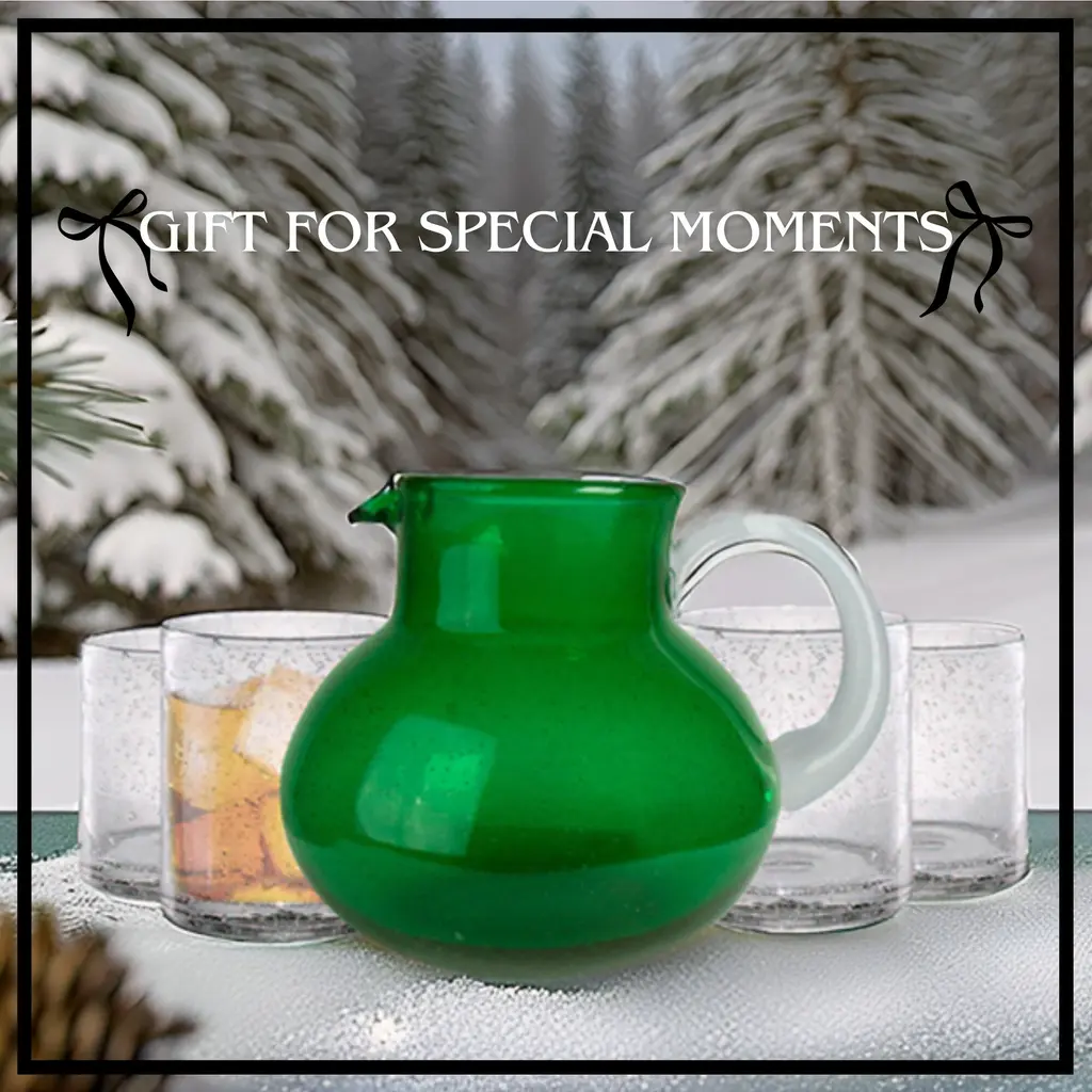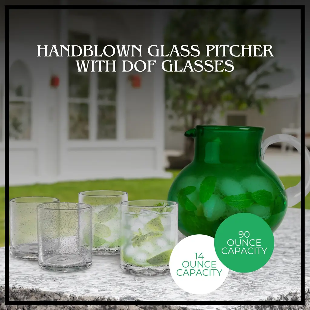 Artland Iris Pitcher with DOF Glasses SetArtland Iris 90oz Hand Blown Pitcher & Double Old Fashion 14oz Glasses (Set of 4) - Lead-Free Bubble Shape Glassware for Stylish Serving and Dining - Kitchen Essential & Table Decor - NewElevate your dining experience with the Artland Iris Hand Blown 90oz Pitcher and 14oz Double Old Fashion Glass Set. This striking glassware set marries artistry with functionality, featuring a unique hand-blown bubble shape that adds character to any table. The 90oz pitcher offers ample capacity for serving a variety of beverages, from water to iced tea, making it a versatile addition to your home. Accompanying the pitcher are four 14oz double old-fashioned glasses, designed for enjoying cocktails, juice, or water with style. Each piece in the set is crafted from lead-free glass, ensuring safe use without compromising on durability or design. The Artland Iris set is ideal for those who appreciate thoughtful details and quality craftsmanship in their everyday dining. Whether hosting a dinner party, enjoying a casual meal, or preparing for a special occasion, this glassware set is sure to impress. Its design complements any table setting, from contemporary to classic, making it an essential piece for both everyday dining and entertaining. Add the Artland Iris set to your collection and enjoy a blend of beauty and practicality in your drinkware.FEATURES:MATERIAL:WHAT'S IN THE BOX:PACKAGING: Retail Packaging
