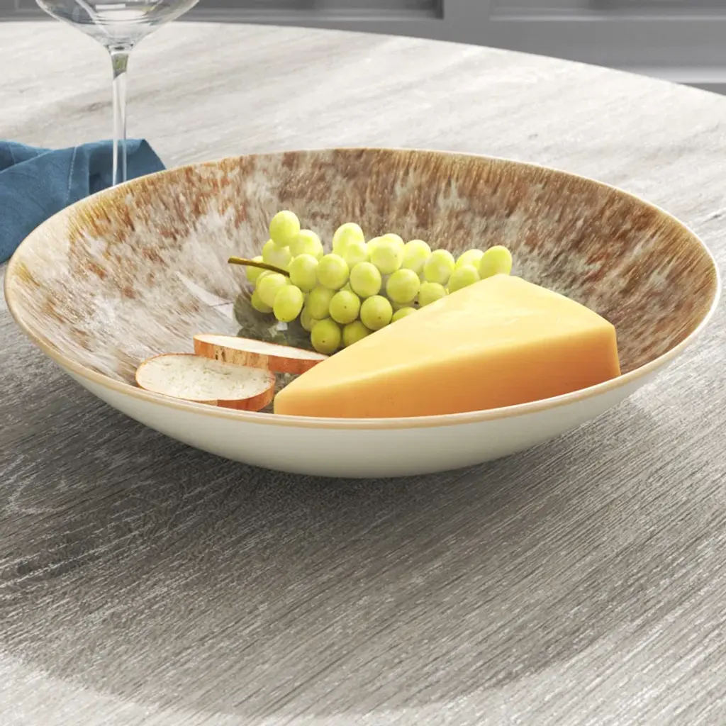 Whether the perfect spot to hold fresh fruit or serve up your next main course, a serving bowl like this is ideal for creating an eye-catching centerpiece in your dinnerware. Crafted from chip-resistant stoneware, this piece features a reactive brown glaze that creates a striking mottled look. And since it's microwave and freezer-safe, it's easy to keep whatever you're serving at the right temperature. When it's time to clean up after dinner, just toss this piece in the dishwasher for fuss-free maintenance.