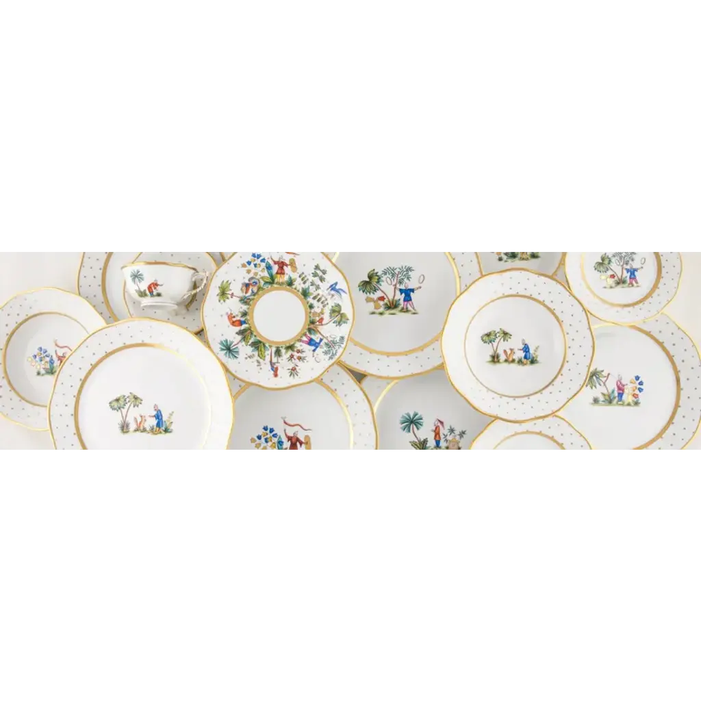 Inspired by a pair of cups designed in Vienna in the early 19th century, the Asian Garden pattern is a superlative example of Chinoiserie design with fanciful, exuberant images of life in an imagined China. Now the biggest porcelain manufactory in Europe, Herend was founded in 1826 to produce earthenware in the small Hungarian village for which it was named. At the time, Hungary was flooded with low-cost pottery, but in 1839, Mor Fischer became the Manufactory’s new owner and he decided to focus on producing dinnerware replacement pieces for Europe’s royal families to complement their valuable porcelain patterns from Germany and the Far East. As his client base grew, Fischer commissioned his artists to begin designing dinnerware patterns of their own. Queen Victoria’s 1851 purchase of a large set for Windsor Castle was a milestone, setting the stage for aristocrats throughout Europe to clamor for Herend in their estates. In the 1850s, Herend added meticulously-crafted figurines to its creations. Herend’s trademark fishnet pattern, which is widely recognized and prized as Herend’s signature design, started in 1858 when an artist who was intrigued with a Chinese plate’s fish scale design painted it onto a rooster figurine to imitate feathers.