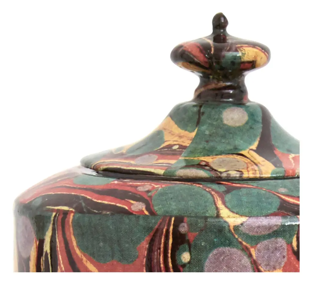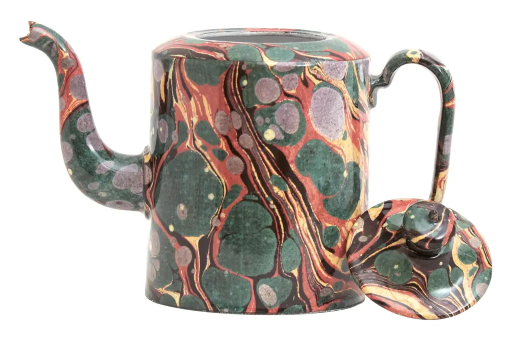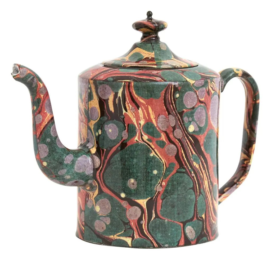 Pairing a 19th century-inspired pottery design with a delightful swirling motif, the Marbled Teapot looks lovely alongside almost any serveware collection. The story starts in renowned ceramicist Astier de Villatte’s Paris workshop, where this delicate piece is handcrafted from black terracotta following old-school techniques passed down for generations. Rather than the brand’s signature milky white glaze, however, its exterior is patterned with a reproduction of a multi-colored vintage marbled endpaper, taken from celebrated designer John Derian’s expansive collection of antique images. Perfectly imperfect, we think it would make a wonderfully unique addition to any tabletop or tea service. •black terracotta clay •vintage marble glazed exterior •white glazed interior •marble pattern may vary from piece to piece •handwash only •not microwave safe •astier de villatte in collaboration with john derian •handmade in paris •each is unique Dimensions •12"W x 6" diameter x 9"H