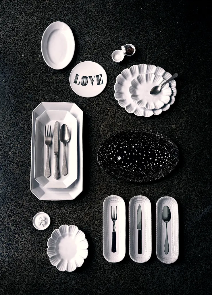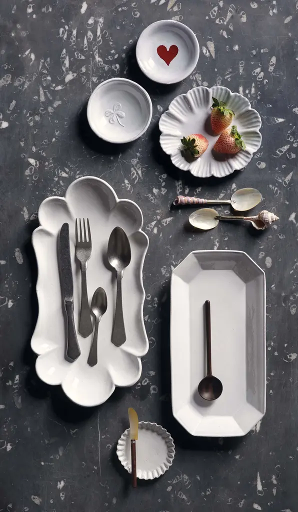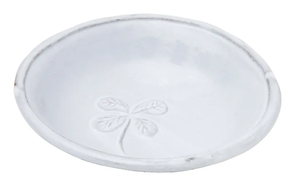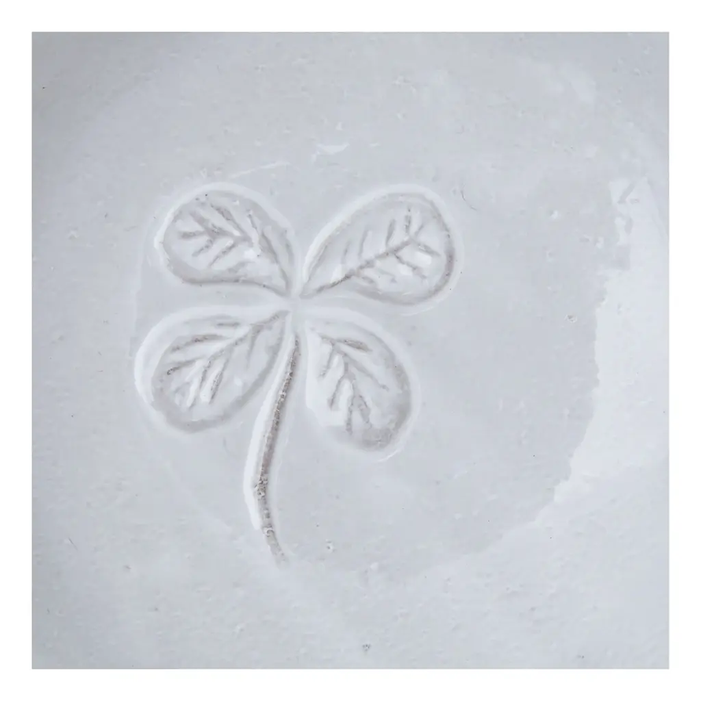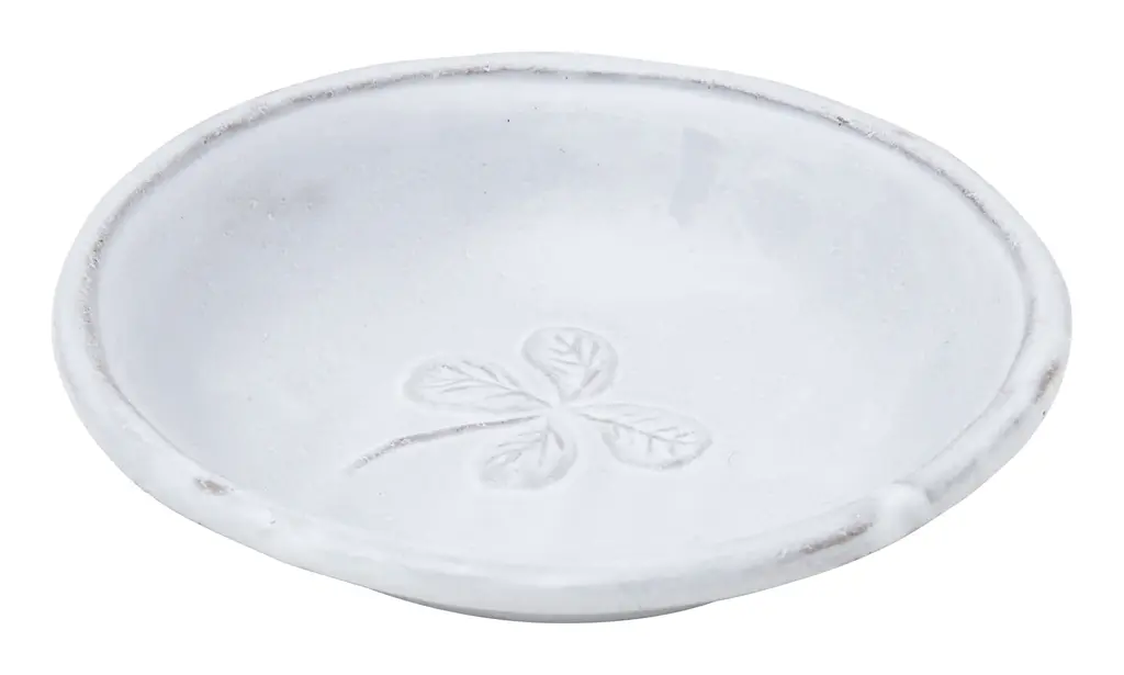 Add a lucky charm to your serveware collection with our pretty little Astier de Villatte Trèfles Dish. Inspired by 18th- and 19th-century pottery designs, this shallow bowl comes to us from renowned ceramicist Astier de Villatte’s historic Paris workshop, where it was handcrafted from black terracotta clay following old-school methods passed down for generations. It’s finished with a relief carving of a delicate four-leaf clover at its center and coated with the brand’s signature milky white glaze for a classic feel. A sweet addition to any tablescape, we love Trèfles for serving up sauces and condiments at the dinner table or filled with nuts or olives on a chic charcuterie board. Outside of the dining room, it also makes a great catchall dish for jewelry and other precious items on a bedside table or powder room counter. •black terracotta clay•white glaze•astier de villatte •handmade in paris•each is unique Dimensions •5.25" diameter x .5"H
