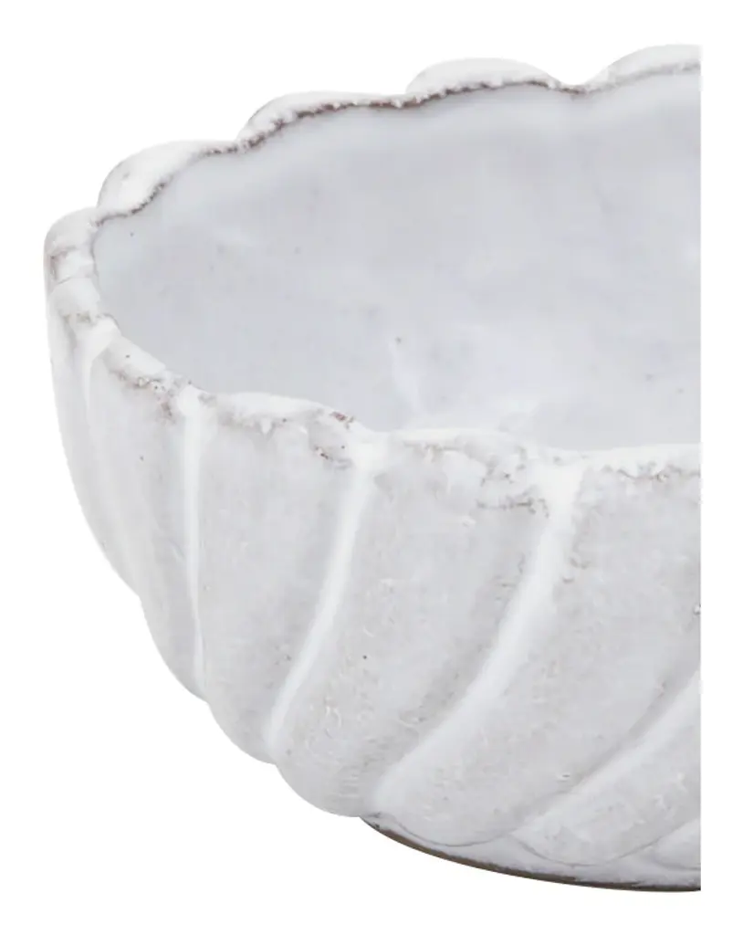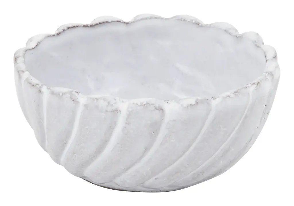 We love the vintage feel of the charming Peggy Small Dish. Inspired by 19th century pottery designs, this tiny bowl comes to us from renowned ceramicist Astier de Villatte’s historic Paris workshop. There, it was handmade from black terracotta clay following old-school methods passed down for generations and finished with the brand’s signature milky white glaze. With its sweet scalloped edges and footed base, our petite Peggy is great for serving up sauces or small portions of sweets or snacks. Outside of the kitchen, it also makes a lovely addition to the nightstand or dressing table for cradling jewelry or other trinkets. •black terracotta clay•white glaze•astier de villatte •handmade in paris•each is unique Dimensions•2.75" diameter x 1.25"H CARE INSTRUCTIONS •handwash only •not microwave safe