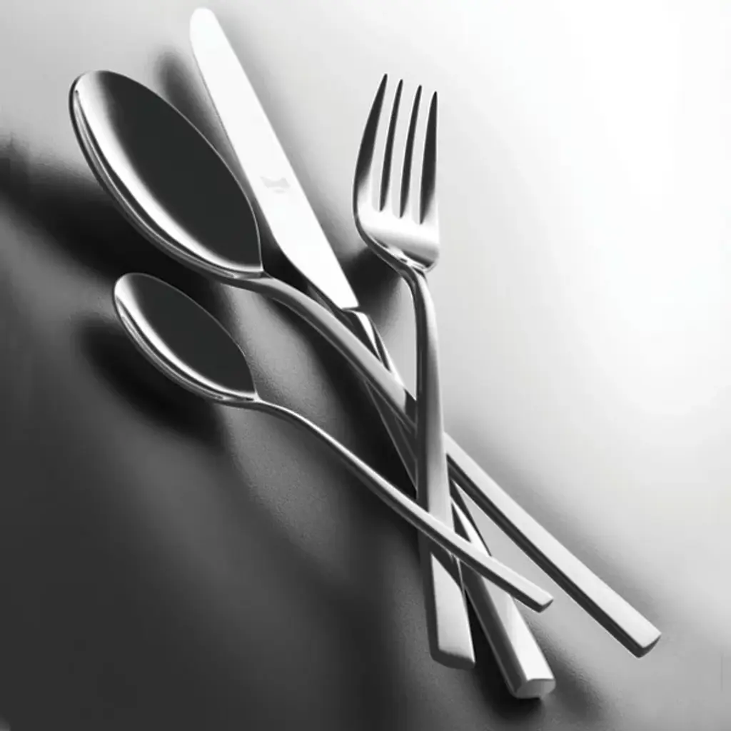 Atena 5-Piece Flatware Place Setting by Mepra offers an exquisite blend of contemporary design with exceptional craftsmanship. Made from high-quality 18/10 stainless steel, this luxury cutlery set is designed in Italy and brings elegance to any dining room. Its dishwasher-safe feature ensures easy cleaning, keeping the set looking pristine. The double serration on the knives provides durable sharpness, perfect for everyday use or special occasions. Elevate your dining experience with the Atena Cutlery Set, a perfect addition to your collection.