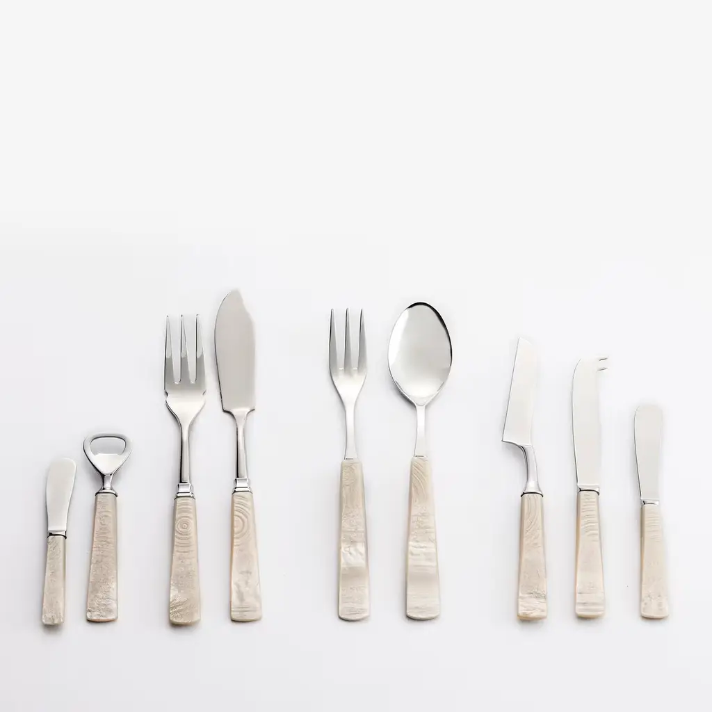 A refined addition to a personal collection or delightful housewarming gift, this set synthesizes sustainability and glamorous organic flair. The handles are fashioned of plant-based certified sustainable resin, showcasing an alluring nacre-like appearance rich in realistic textural and shading details. The stainless steel upper enhances the general luminosity with its glistening, mirrored finish delivering pure elegance.
