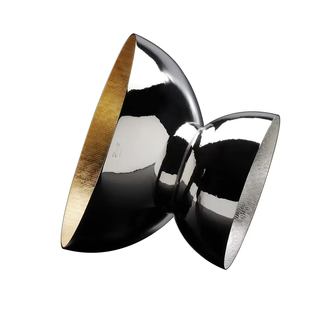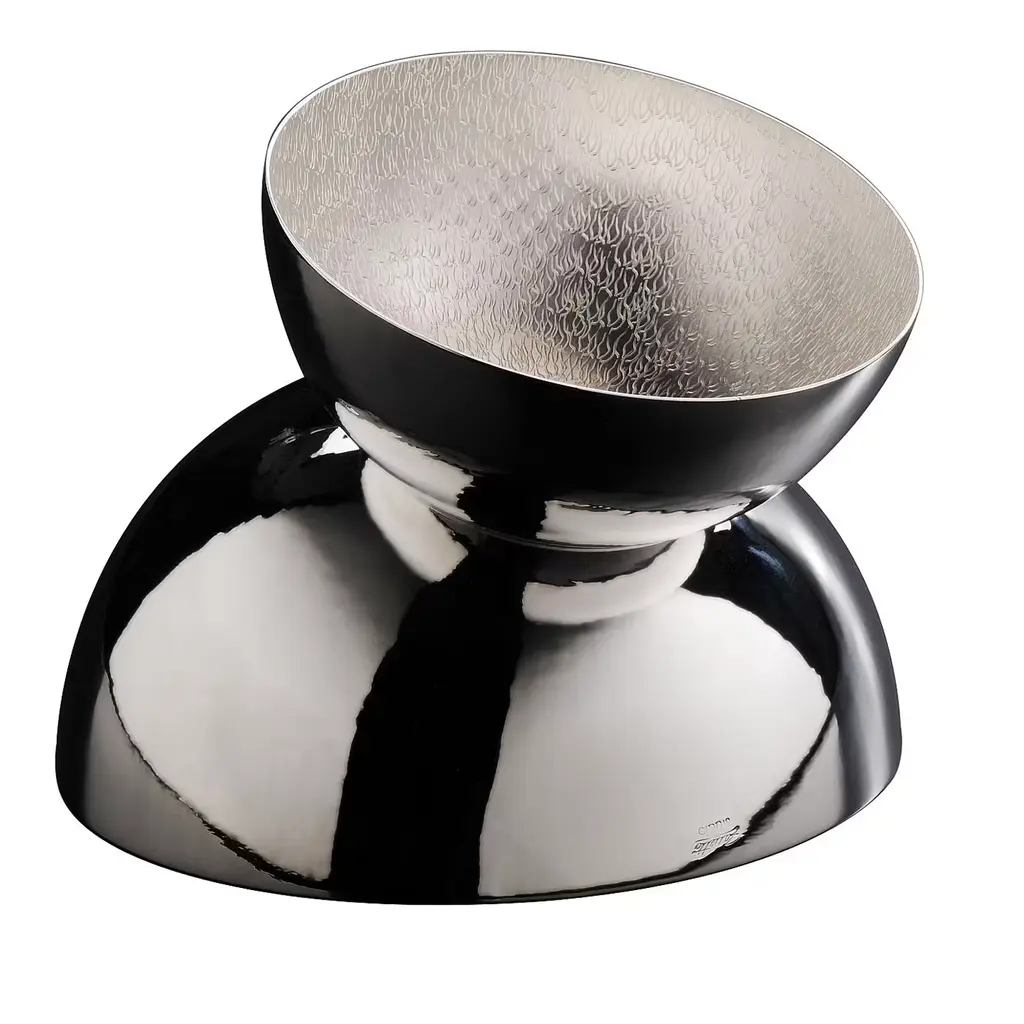 This exquisite cup bears a modern design evident in the minimalist structure, the semi-spherical base and the large opening at the top, which can in turn become the base supporting a smaller cup. The interior of both bowls features a precious multifaceted texture obtained by hand-hammering the surfaces which are golden on one side and silver on the other. Versatile and functional, this elegant piece of design can be used as a drinking cup, a centerpiece, or a small tray to display small objects or finger food.