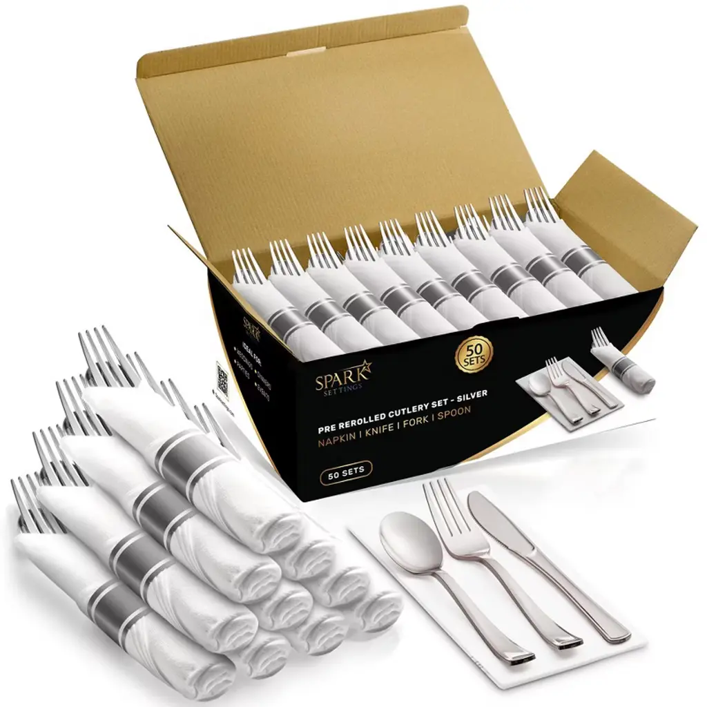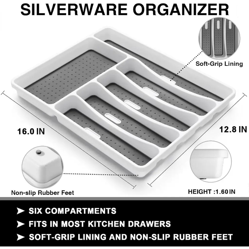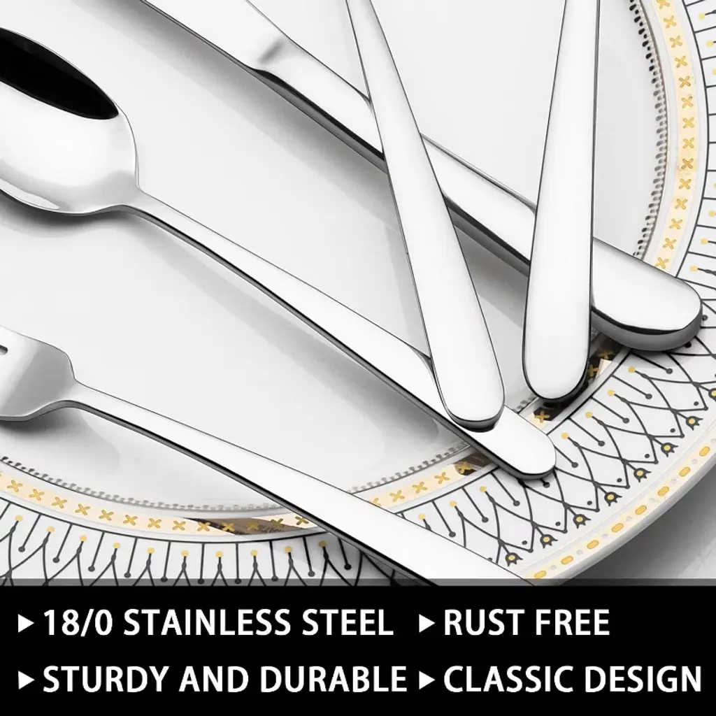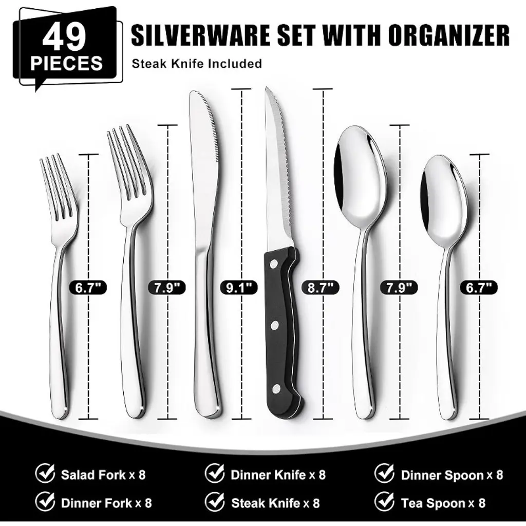 This 49-piece silverware set comes with an organizer, including 8 dinner forks, 8 salad forks, 8 dinner knives, 8 dinner spoons, 8 teaspoons, and 8 steak knives, meeting the dining needs of 8 people. It is very suitable for restaurants, weddings, parties, family gatherings, or daily home use. Made of high-quality stainless steel, the tableware is rust-resistant, corrosion-resistant, thick and durable, and not easy to bend or deform during use. The classic and simple design combined with mirror polishing technology gives it a bright appearance, which can match various styles of tableware and enhance the table style. The edge of the handle is smooth, with moderate weight and balance, comfortable to hold, and easy for both adults and children to use. Moreover, it can be cleaned in the dishwasher for convenient cleaning, and is equipped with a 6-compartment drawer organizer, which is about 12.8 inches × 16 inches, allowing easy storage of tableware and making the kitchen cleaner.