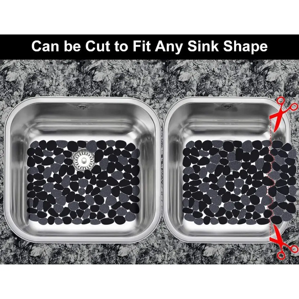 This 2-pack of Black Pebble Sink Mats (15.8x12") is a practical protector for stainless steel, porcelain, and other sinks—plus your delicate dishes and glassware. It blends a unique pebble design, stain-resistant classic black, adjustable size, and easy maintenance, working seamlessly in kitchens, bathrooms, and laundry rooms. Modern Design & Protective: Boasts a unique pebble design that’s gentle on your fine serving pieces, porcelain dishes, ceramic items, and glassware. It also shields your sink from scratches or damage, making it the perfect choice for keeping both your valuables and sink in great condition. Widely Used: Features a classic black color that complements any sink style. Unlike clear sink mats, it won’t stain easily—standing up to years of regular use without looking worn. It’s versatile too: use it in kitchen sinks for dishes, bathroom sinks for toiletries, or laundry room sinks for delicate items. Adjustable Size: Each mat measures 15.8x12", and it’s easy to cut and trim. This lets you customize its shape to fit any sink—no need to worry about it not matching your sink’s layout or dimensions. Easy to Maintenance: To avoid the mat getting greasy and hard to clean over time, soak it in soapy water after each use, then scrub it with a sponge or scrubber before letting it dry. Important note: If it gets stained by spaghetti sauce, clean the stain immediately to keep the mat looking fresh.