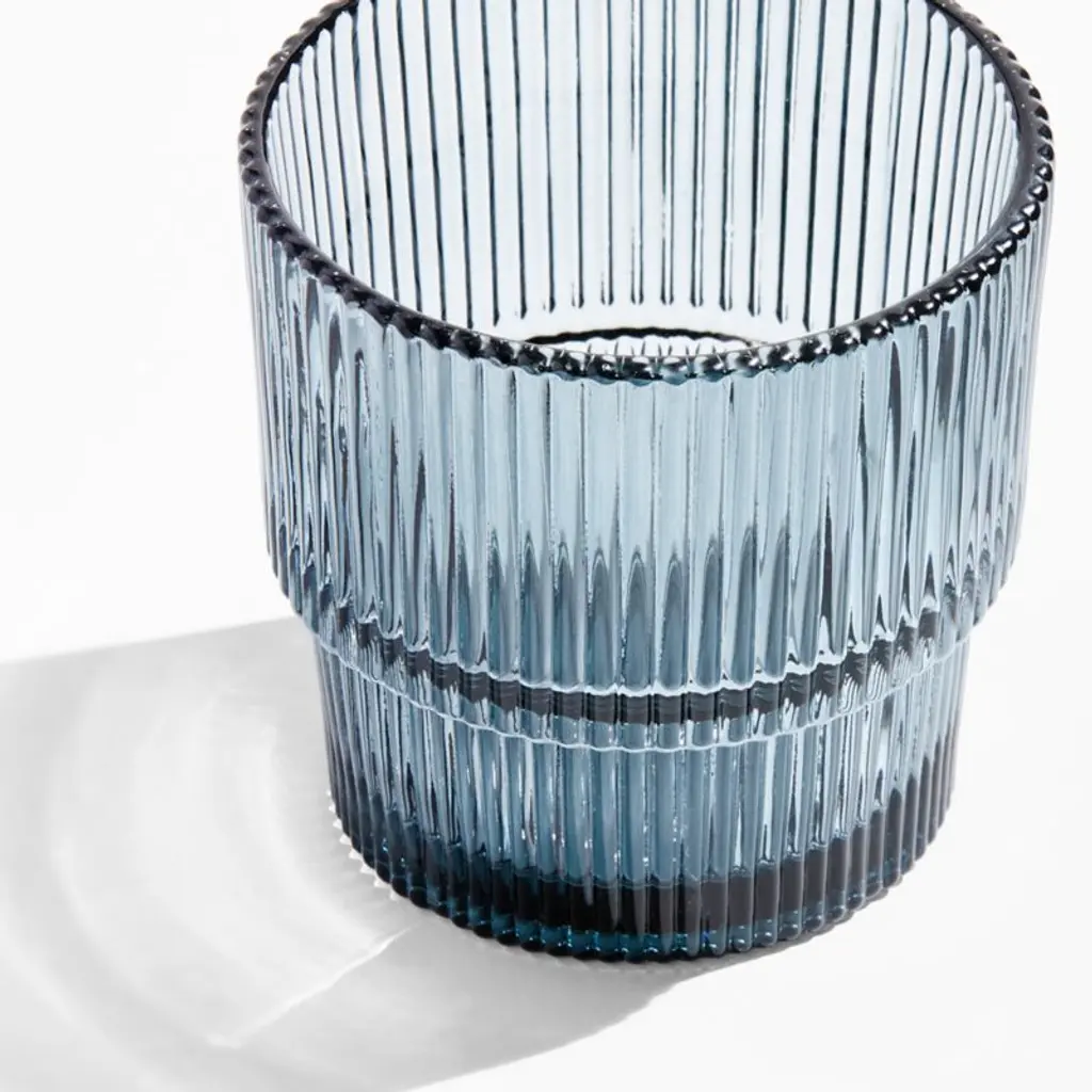 Sparkling tiers of ribbed glass shape a double old-fashioned glass equally suited to casual sips of iced tea and refined cocktails. Eye-catching in translucent indigo, the stackable rocks glass features a ridged surface to catch the light as well as provide a sturdy handhold. The fresh blue hue mixes and matches beautifully with the other pieces in our exclusive Atwell drinkware collection.