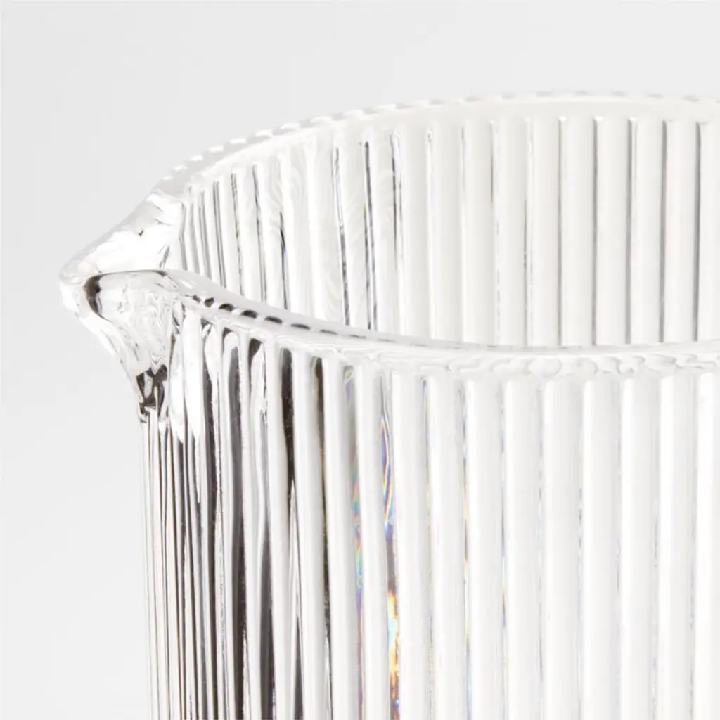 Sparkling tiers of ribbed glass shape a pitcher equally suited to casual pours of iced tea or batched cocktails. Made of clear glass, the eye-catching pitcher features a generously sized handle, decorative recessed base and a ridged surface that catches the light. Use with our Atwell glassware for a coordinated bar cart or brunch beverage depot. Dishwasher-safe for easy cleanup, the ribbed Atwell pitcher is a Crate & Barrel exclusive.
