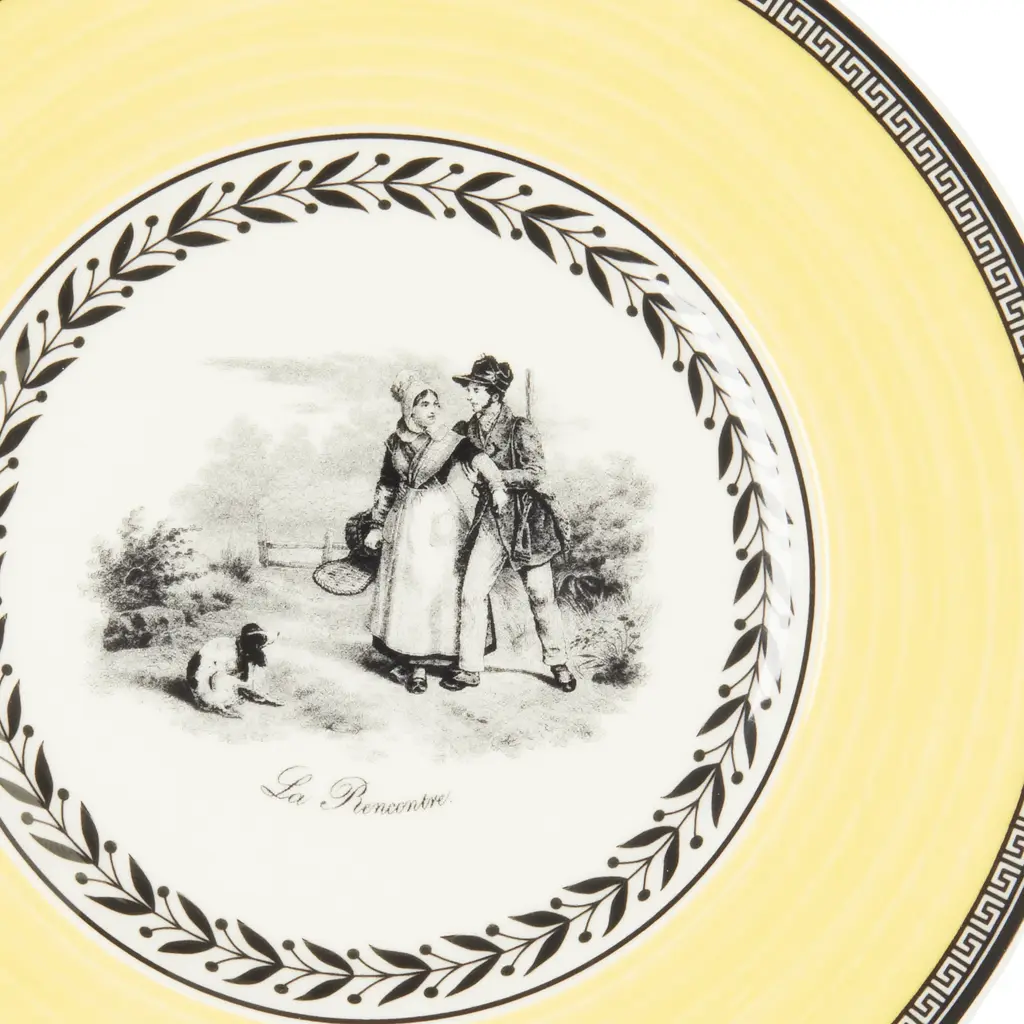 A classic copperplate design named for the home of Villeroy & Boch, featuring an array of plates that can be combined for dramatic effect. Dinner plate, salad plate, bread & butter plate, rim soup bowl, jumbo cup, mug, and after dinner cup.
