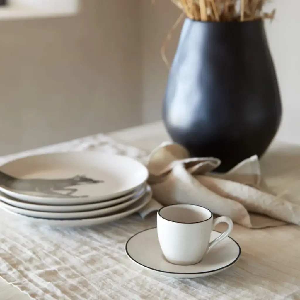 Matte-beige surface with bold rims and patterns Contemporary and versatile, Augusta takes on a natural feeling, balancing a matte-beige surface with bold rims and patterns. The collection highlights a selection of neutral dinnerware pieces with a black rim which can be combined with the patterned designs to add an eclectic touch to each table setting. Whether there is a celebration or a simple gathering, Augusta provides a table suitable for all tastes. Named after a small fishing village famous for its colorfully painted wooden houses, Costa Nova combines ancient European craft traditions, elegant design and quality to create fine stoneware pieces. Using the best natural resources in Portugal, Costa Nova pieces are known for their color and exceptional durability.