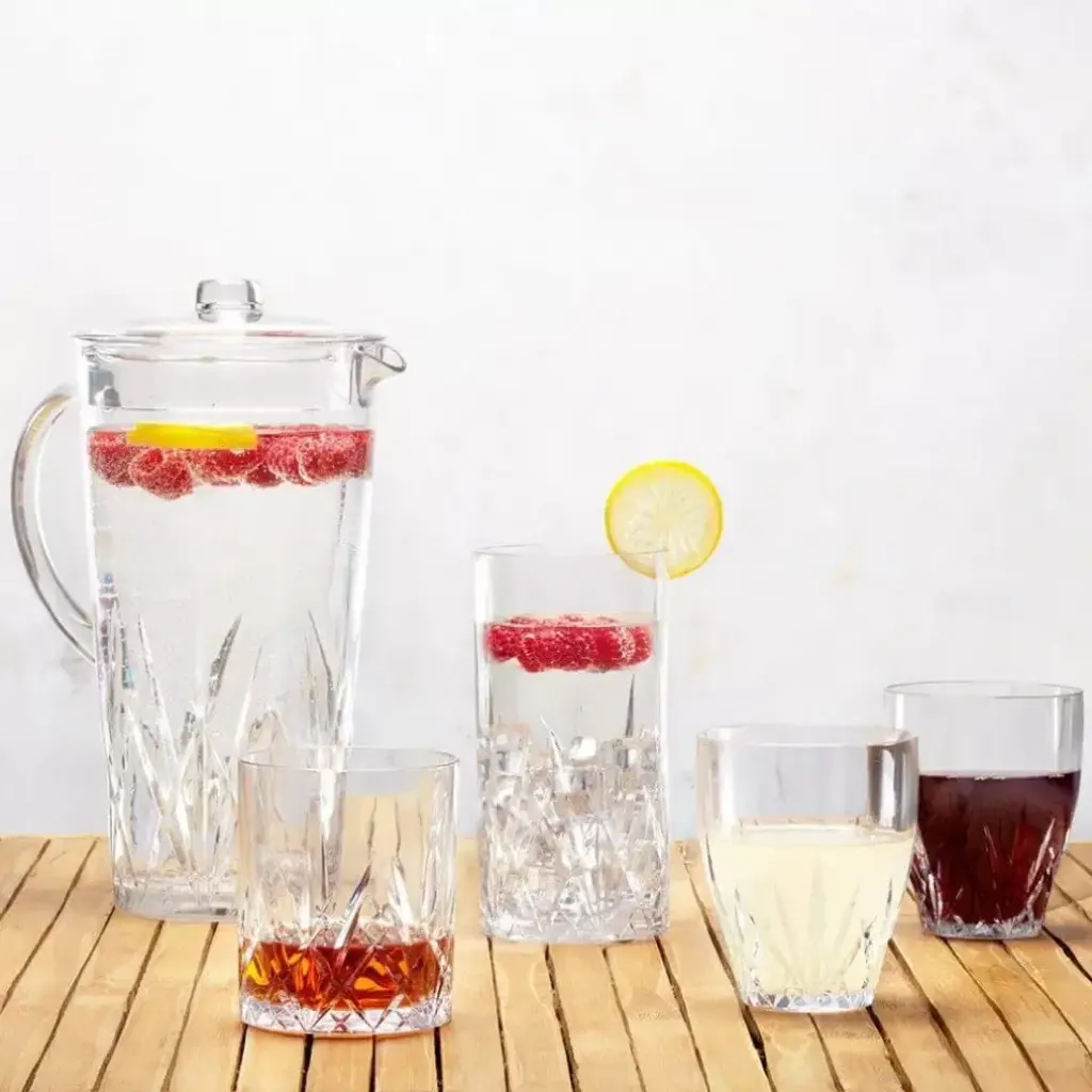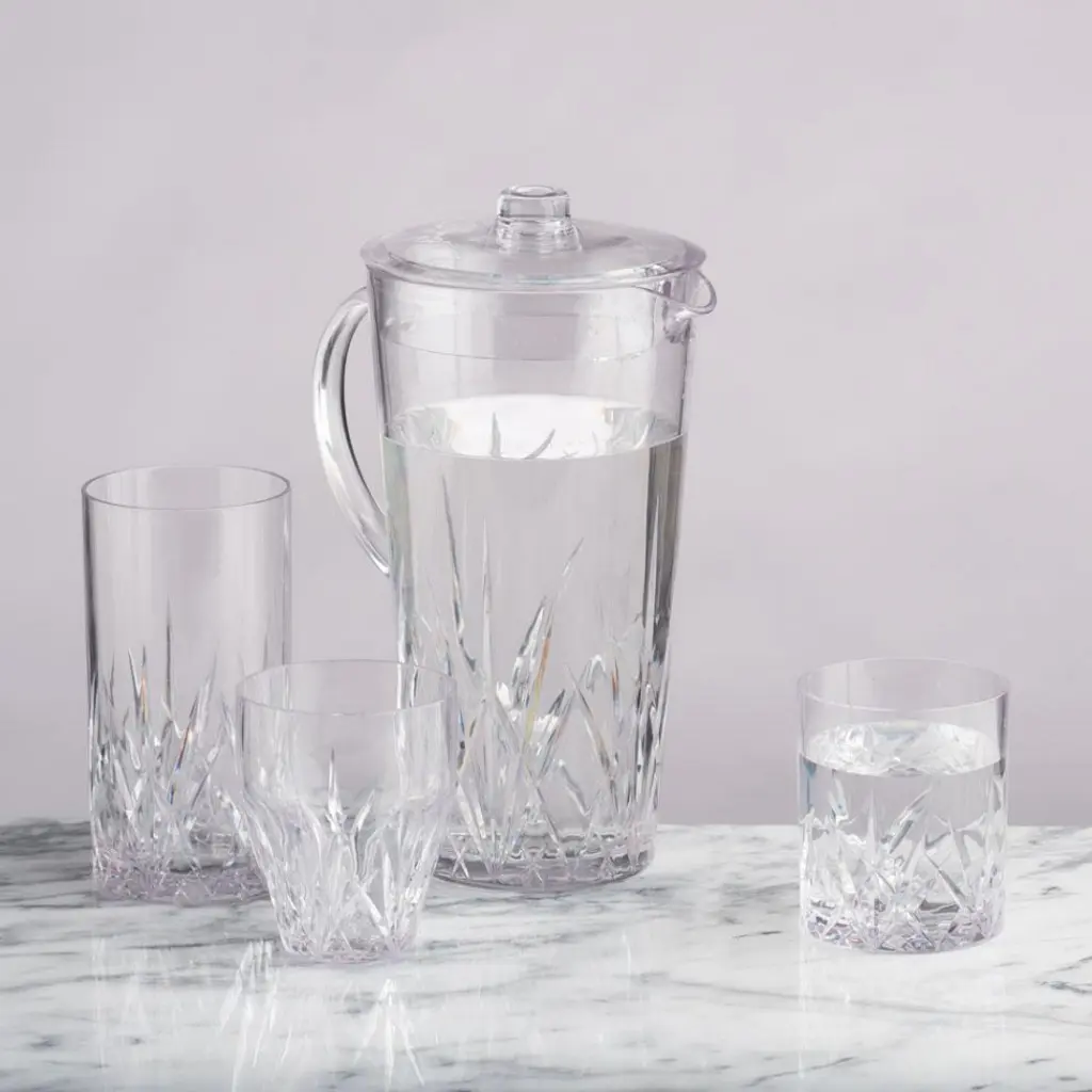 Serve crisp cocktails to sweet lemonade in carefree style with our Aurora Crystal Cut pitcher. Crafted in BPA free and dishwasher safe unbreakable Tritan, which is higher in quality than regular acrylic glasses, our intricately designed crystal cut drinkware also features a stemless wine glass, DOF tumbler, and highball tumbler.