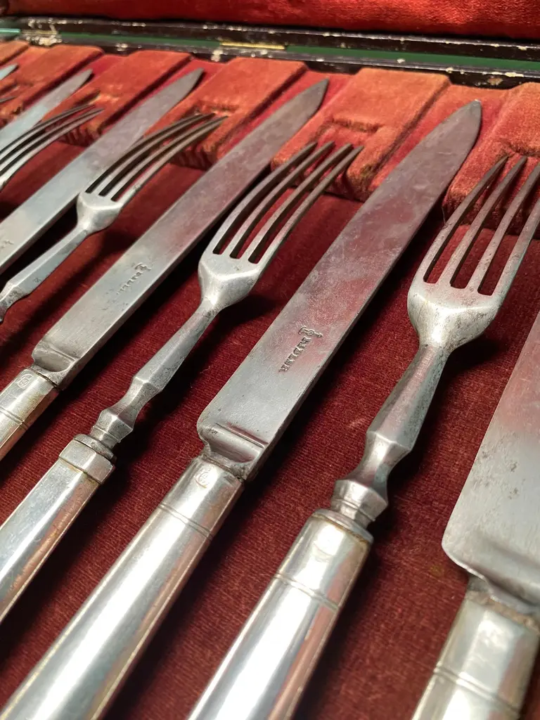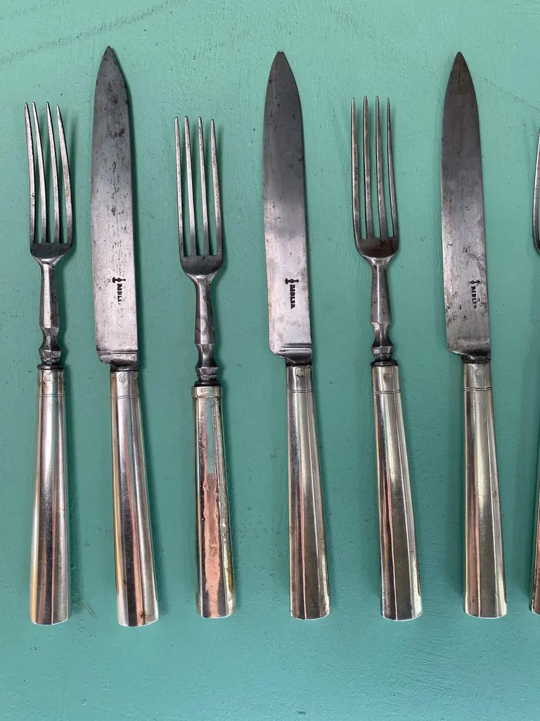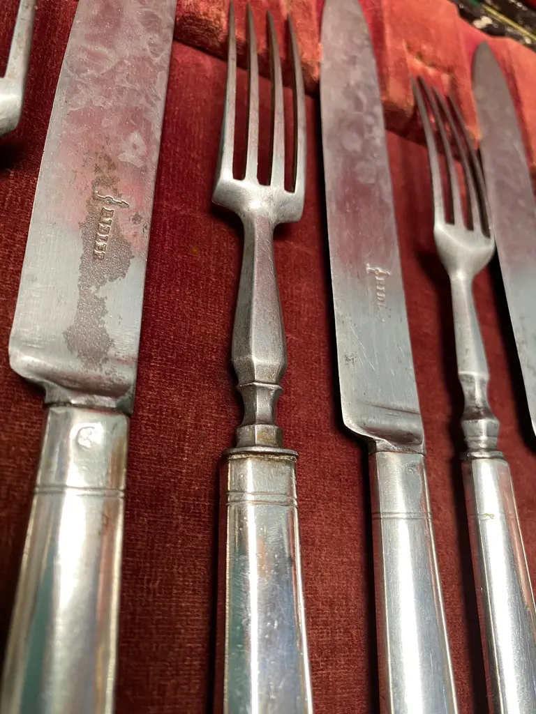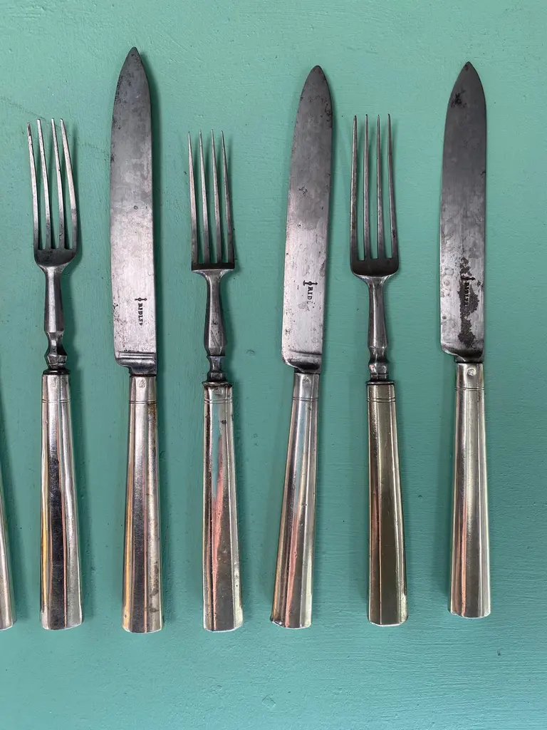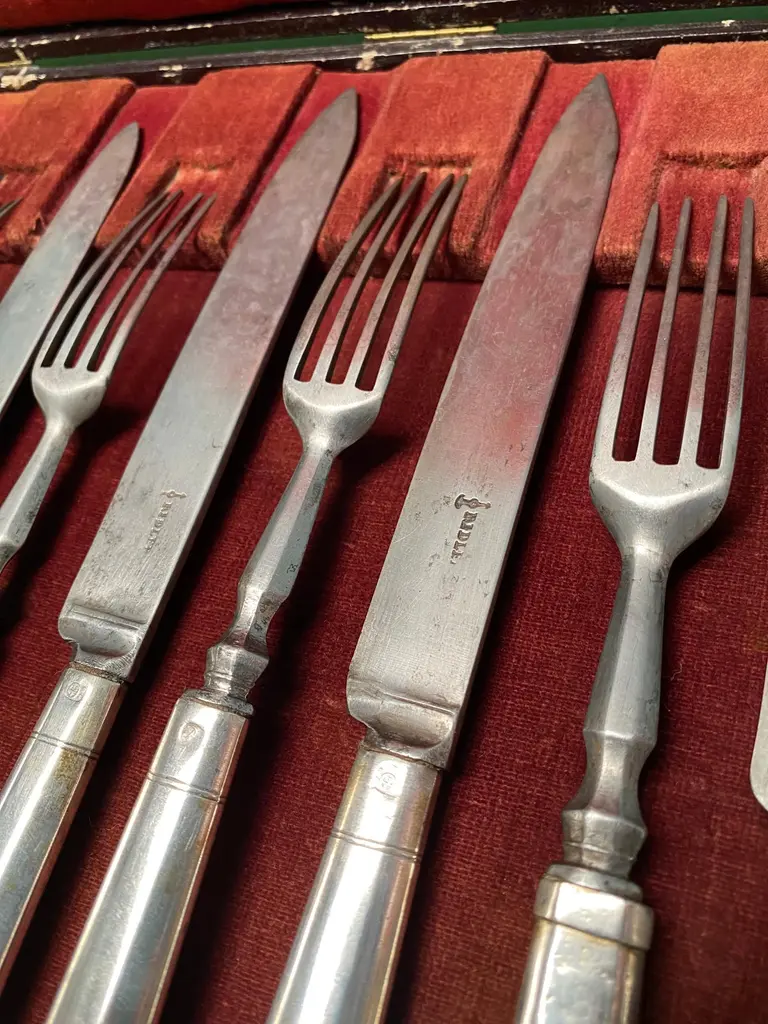 An impressive set of twelve early nineteenth century Neoclassical knives and forks with Austrian Empire sterling silver handles and original early 19th century steel blades. Original or appropriate-to-period box included. The blades stamped with an arrow and the cutler's trade name clearly marked, 'Ridler'. They are 13 loth standard (81.2% silver), with indistinct but just legible city marks and makers mark 'IR', 'JR' or perhaps 'PR'.The handles are hollow silver with an octagonal profile, in a simple Neoclassical style. Well used over their nearly two hundred year life, they were an inheritance, which, to the best of the heir's knowledge had been in his family since manufacture. The line of succession, whether maternal or paternal, has been lost. Well worn Austrian silver marks show the Viennese shield and number 13 (for loth silver quality) with city marks and dates indistinct. Carefully magnified examination shows dates around 1830-1838 on those still legible, however this could be debated as they are very well worn. Three fork handles are later replacements with indistinct or unidentified silver marks but in the same style, well aged and used, but of the same quality. Most tellingly, the cartouche or surround of the city mark is still clearly visible and, when compared to known marks, this shape is only represented in the city marks that of E (Hall), F (Brno) or H (Graz), Austria. A makers mark 'JR', 'PR' or 'IR' is discernible by comparing the visible parts of the markings on several of the knives.In addition to this wonderful, storied set of cutlery, the box appears to be original or is at least period appropriate. It certainly has the restrained neoclassical style and quality of construction of the early 19th century. It is made of timber, covered in a fine Morocco leather. Both sides of the box, lid and base, have reacted to humid conditions by curling back and cannot be fully closed, however, the lovely russet satin and velvet lining are in pretty good condition and make a fitting storage place for the cutlery. Therefore we are selling the box with the cutlery, as is. You may want to consult a book binder or other restorer to have the box brought back to it's former shape and condition. The steel of the forks and knives is in remarkably good condition considering its age and use. There are signs of sharpening on a stone wheel, probably by a traveling knife sharpener. In many European countries, traveling knife sharpeners were commonly known as "arrotini" (Italian for "sharpeners"), or "moletas" (also Italian, referring to the portable grindstone). In English, they might also be referred to as "itinerant sharpeners" or "knife grinders". In any case, the blades have been kept sharp and ready for use. The well-used condition of this whole set is a large part of it's charm. It suggests it's been brought out for dinners frequently over the last nearly 200 years. A fork handle has succumbed and been replaced here and there. There are many small dents and dings. It is a rag-tag collection and why would it not be? After what must be hundreds of meals and many house-moves, in the grander arc of European wars, long sea voyages and the ups and downs of family fortunes, there have been weddings, birthdays, Christmases, graduations, successes and celebrations. All the larger moments of life have been marked by meals with these knives and forks. We suggest you continue their use and enjoyment, adding your own stories and conversations over wonderful meals with interesting people. These knives and forks have absorbed and exude some of the bonhomie, the geniality, of nearly two hundred years of shared dining. Long may they continue to delight.