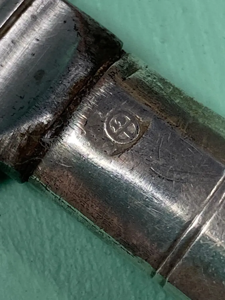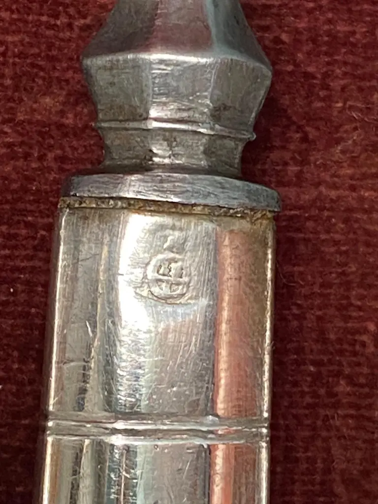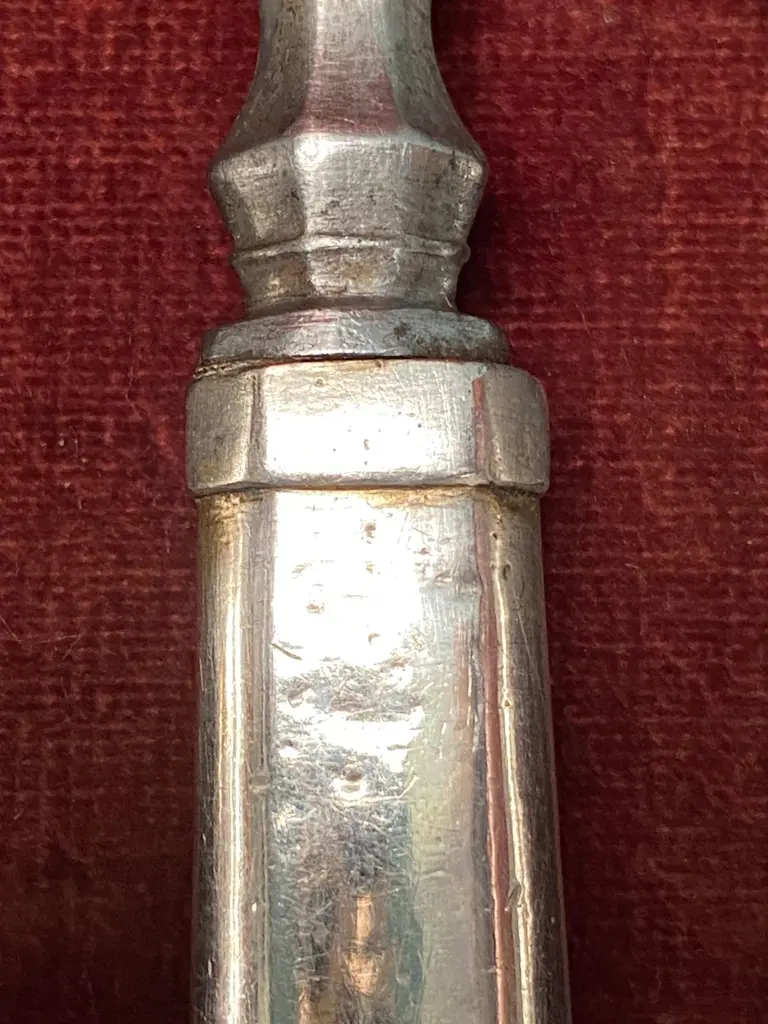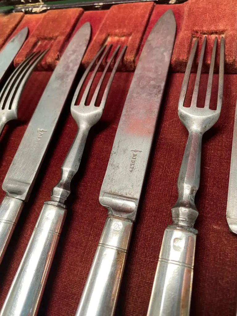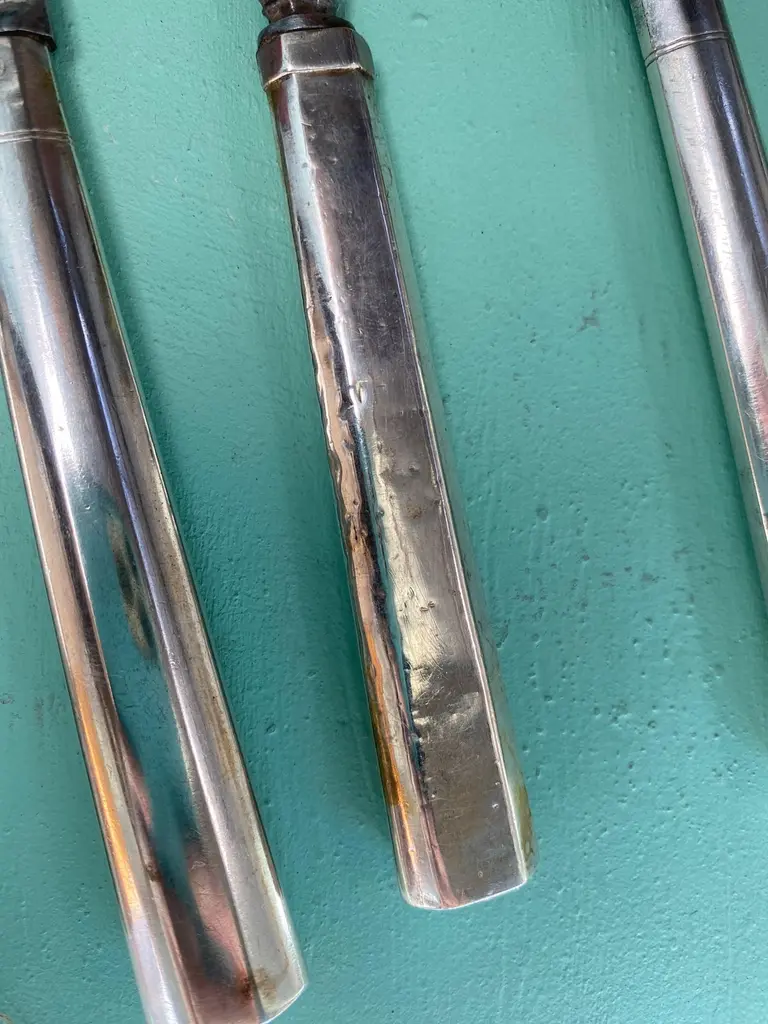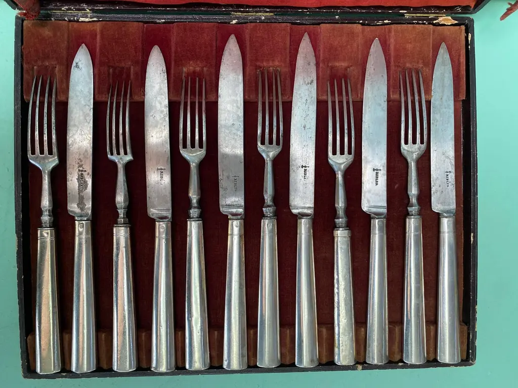 An impressive set of twelve early nineteenth century Neoclassical knives and forks with Austrian Empire sterling silver handles and original early 19th century steel blades. Original or appropriate-to-period box included. The blades stamped with an arrow and the cutler's trade name clearly marked, 'Ridler'. They are 13 loth standard (81.2% silver), with indistinct but just legible city marks and makers mark 'IR', 'JR' or perhaps 'PR'.The handles are hollow silver with an octagonal profile, in a simple Neoclassical style. Well used over their nearly two hundred year life, they were an inheritance, which, to the best of the heir's knowledge had been in his family since manufacture. The line of succession, whether maternal or paternal, has been lost. Well worn Austrian silver marks show the Viennese shield and number 13 (for loth silver quality) with city marks and dates indistinct. Carefully magnified examination shows dates around 1830-1838 on those still legible, however this could be debated as they are very well worn. Three fork handles are later replacements with indistinct or unidentified silver marks but in the same style, well aged and used, but of the same quality. Most tellingly, the cartouche or surround of the city mark is still clearly visible and, when compared to known marks, this shape is only represented in the city marks that of E (Hall), F (Brno) or H (Graz), Austria. A makers mark 'JR', 'PR' or 'IR' is discernible by comparing the visible parts of the markings on several of the knives.In addition to this wonderful, storied set of cutlery, the box appears to be original or is at least period appropriate. It certainly has the restrained neoclassical style and quality of construction of the early 19th century. It is made of timber, covered in a fine Morocco leather. Both sides of the box, lid and base, have reacted to humid conditions by curling back and cannot be fully closed, however, the lovely russet satin and velvet lining are in pretty good condition and make a fitting storage place for the cutlery. Therefore we are selling the box with the cutlery, as is. You may want to consult a book binder or other restorer to have the box brought back to it's former shape and condition. The steel of the forks and knives is in remarkably good condition considering its age and use. There are signs of sharpening on a stone wheel, probably by a traveling knife sharpener. In many European countries, traveling knife sharpeners were commonly known as "arrotini" (Italian for "sharpeners"), or "moletas" (also Italian, referring to the portable grindstone). In English, they might also be referred to as "itinerant sharpeners" or "knife grinders". In any case, the blades have been kept sharp and ready for use. The well-used condition of this whole set is a large part of it's charm. It suggests it's been brought out for dinners frequently over the last nearly 200 years. A fork handle has succumbed and been replaced here and there. There are many small dents and dings. It is a rag-tag collection and why would it not be? After what must be hundreds of meals and many house-moves, in the grander arc of European wars, long sea voyages and the ups and downs of family fortunes, there have been weddings, birthdays, Christmases, graduations, successes and celebrations. All the larger moments of life have been marked by meals with these knives and forks. We suggest you continue their use and enjoyment, adding your own stories and conversations over wonderful meals with interesting people. These knives and forks have absorbed and exude some of the bonhomie, the geniality, of nearly two hundred years of shared dining. Long may they continue to delight.