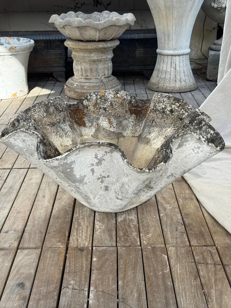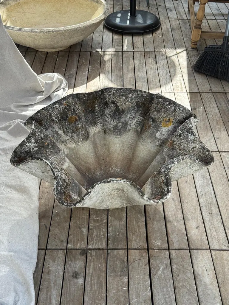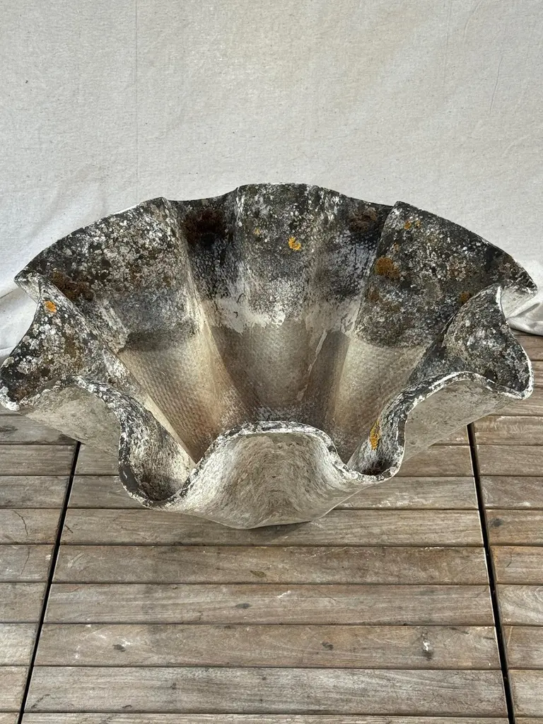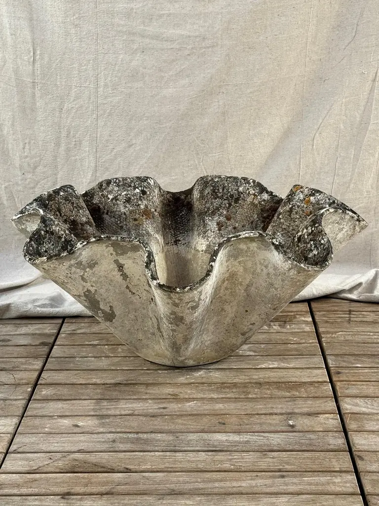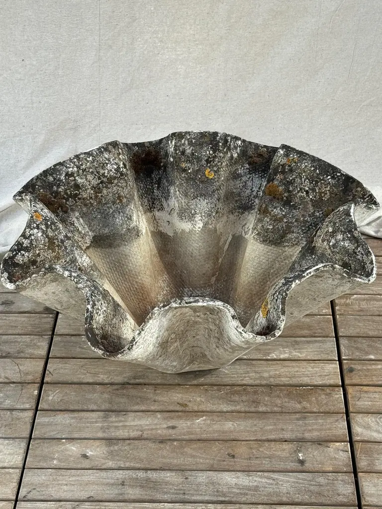 This exceptional mid-century sculptural planter is an authentic “Cupcake” form by renowned Swiss designer Willy Guhl, created for Eternit AG in the 1950s–1970s. Sometimes referred to as the “Moule à Gâteau” (French for "cake mold"), this planter is celebrated for its iconic, fluted silhouette and biomorphic, organic lines, a hallmark of Guhl’s work and Swiss modernist design.Willy Guhl was a pioneering industrial designer whose collaborations with Eternit AG helped define post-war European modernism. His use of fiber cement — a lightweight yet durable material composed of cement reinforced with natural fibers — allowed him to create fluid, expressive outdoor forms that were not only functional but artistically sculptural. The cupcake planter’s wave-like rim, bowl-shaped body, and architectural form make it a standout piece of mid-century garden design. These planters were originally intended to be both practical and weather-resistant, and today they’re coveted by collectors, landscape designers, and architects alike.This particular example has developed a beautiful, naturally aged patina over the decades, with surface variations in tone and coloration from exposure to the elements. You’ll find areas of moss green, rust orange, and mottled gray and white, each a testament to its time outdoors. Unlike newer reproductions, this original has the deep texture and surface character that only years of aging can produce.Its generous size makes it highly versatile: it can serve as a striking garden centerpiece, a dramatic indoor planter in a loft or gallery space, or even a decorative object with sculptural presence. Whether placed in a modernist courtyard, a lush greenhouse, or a minimalist interior, it offers an unmistakable touch of vintage European design.Highly collectible and increasingly rare, especially in this large size and condition, this piece represents the intersection of utility, art, and history, a timeless design that continues to inspire new generations of creators.