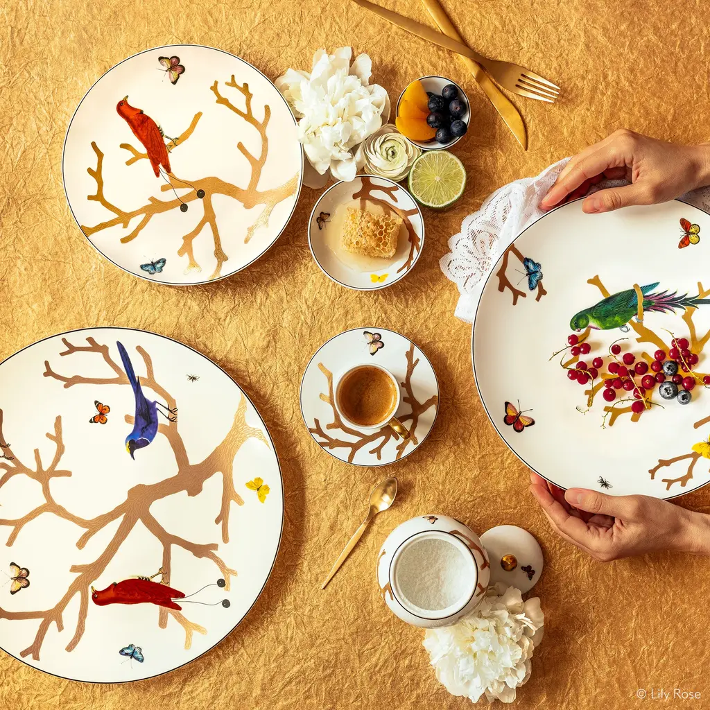 Embellished with a green-breasted woodpecker perched on a golden branch, this nature-inspired porcelain bread & butter plate from Bernardaud brings an elegantly fanciful look to your table.