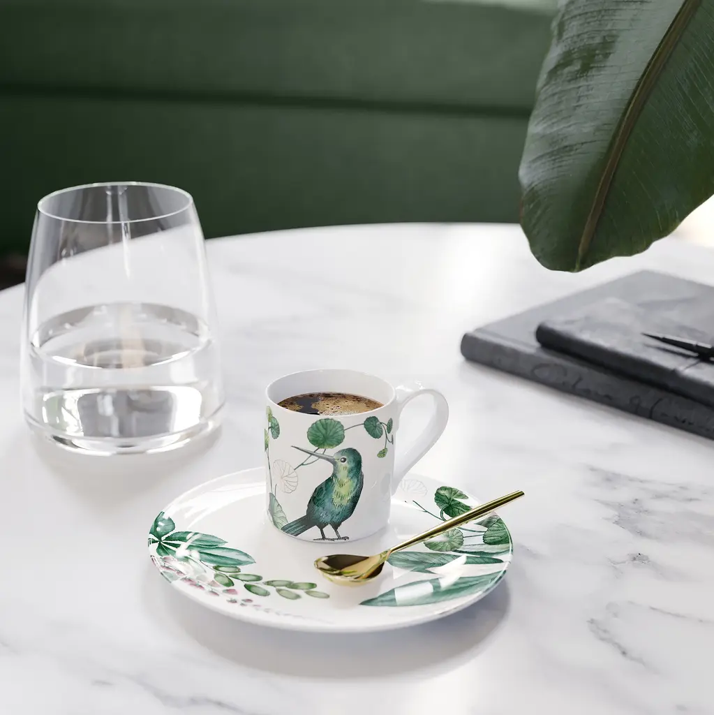 Be transported into a world of birds of paradise and exotic plants with the Avarua dining collection from Villeroy & Boch. It pays homage to the travels of navigator and explorer James Cook, telling the story of his tropical discovery with artistic flair. The premium porcelain collection features intricate flowers, leaves and hummingbirds balanced by 22K-gold detailing for a fantastic, three-dimensional effect.