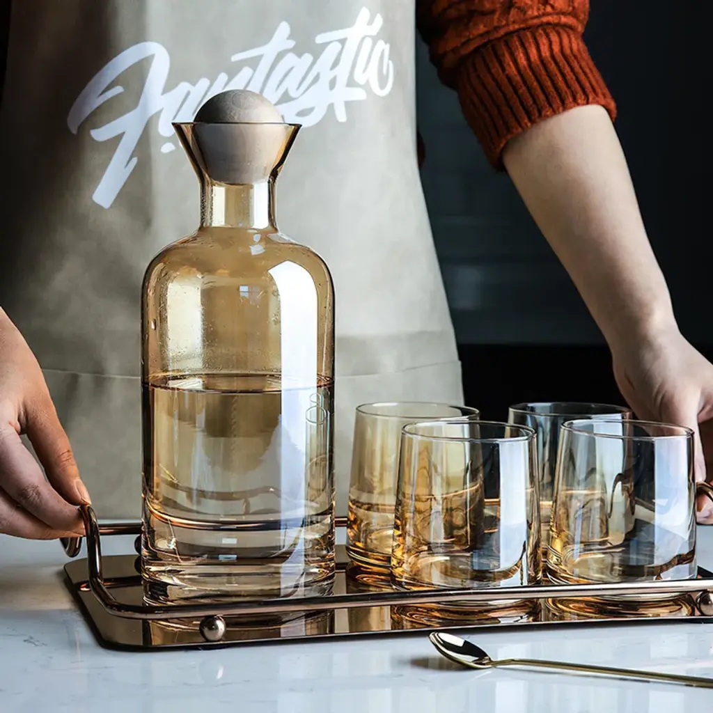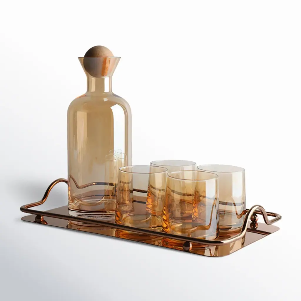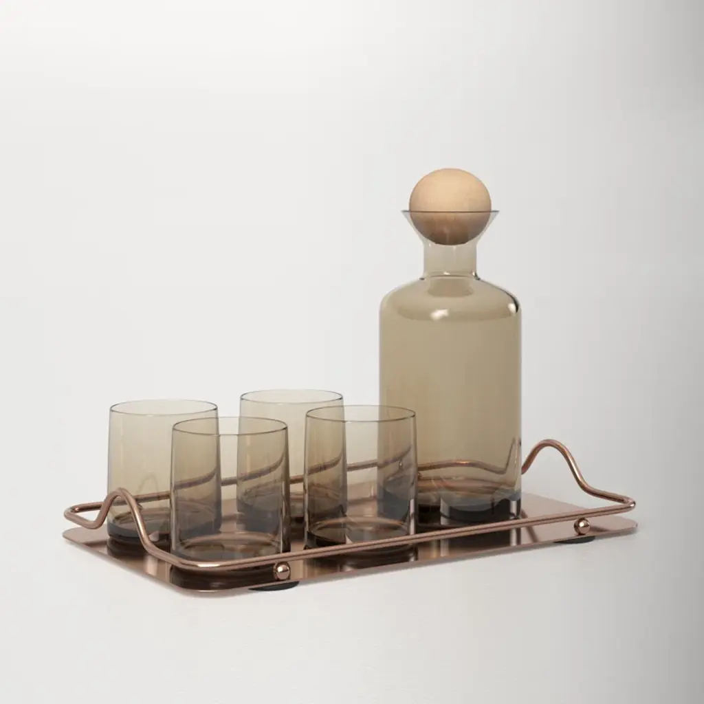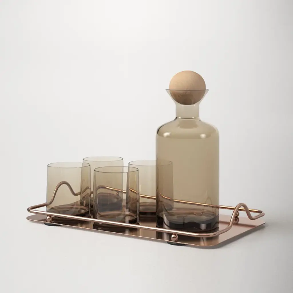 Inspired by sparkling mid-century cocktail culture, this set serves up vividly tinted glassware on a polished metal tray. Four lowball glasses and a decanter elevate spirits – or remind you to drink more water. A wooden lid garnishes the decanter, echoing spherical accents along the tray’s rim.