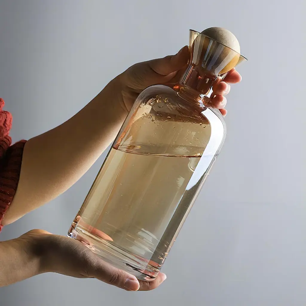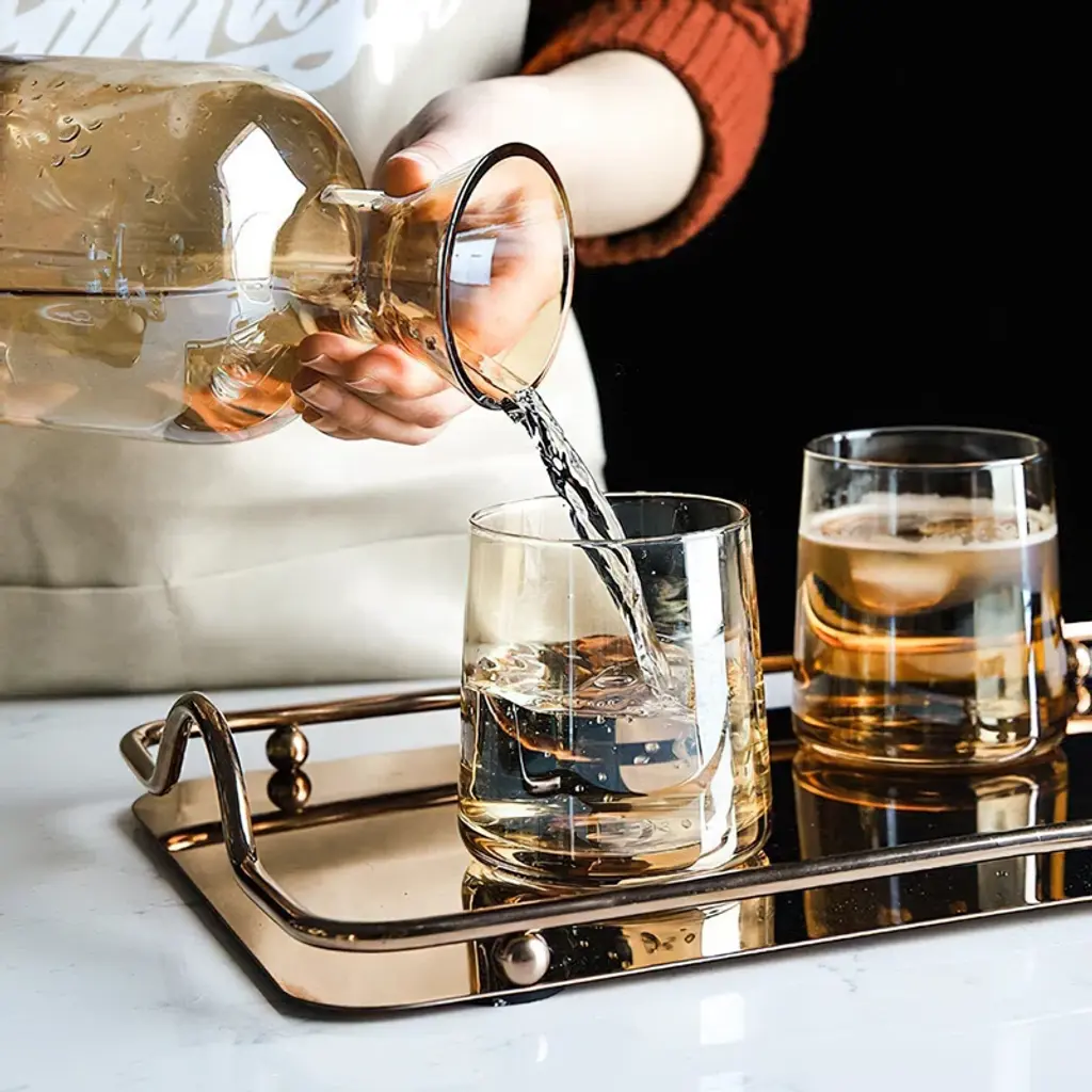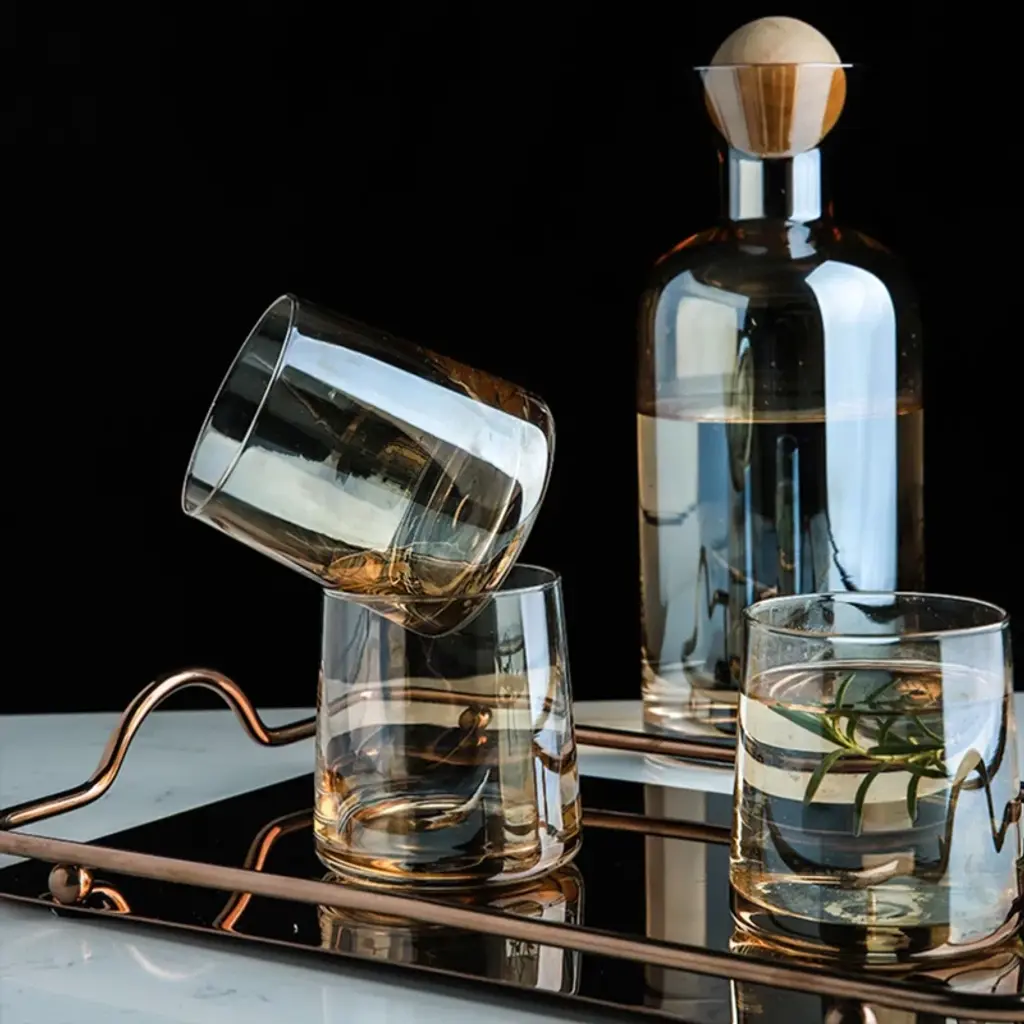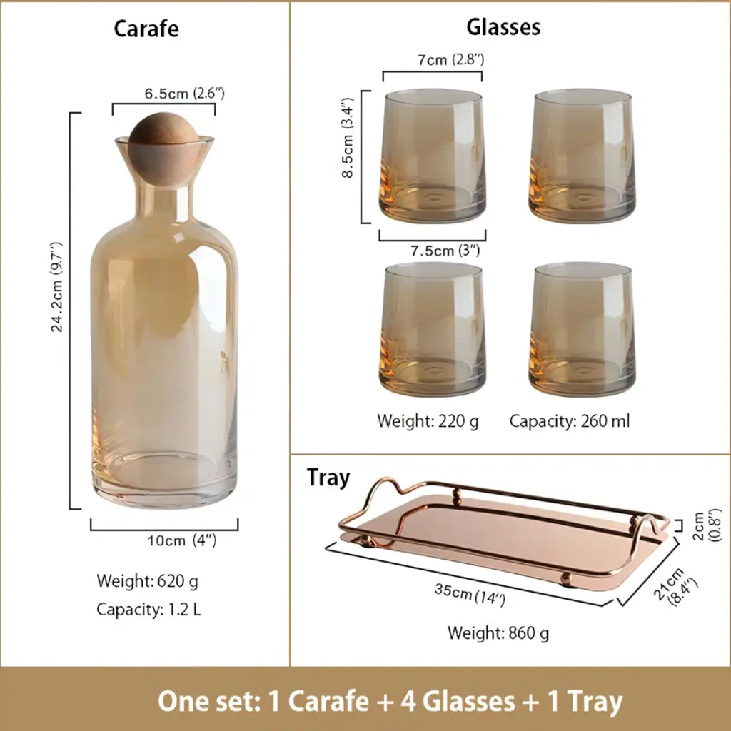 Inspired by sparkling mid-century cocktail culture, this set serves up vividly tinted glassware on a polished metal tray. Four lowball glasses and a decanter elevate spirits – or remind you to drink more water. A wooden lid garnishes the decanter, echoing spherical accents along the tray’s rim.
