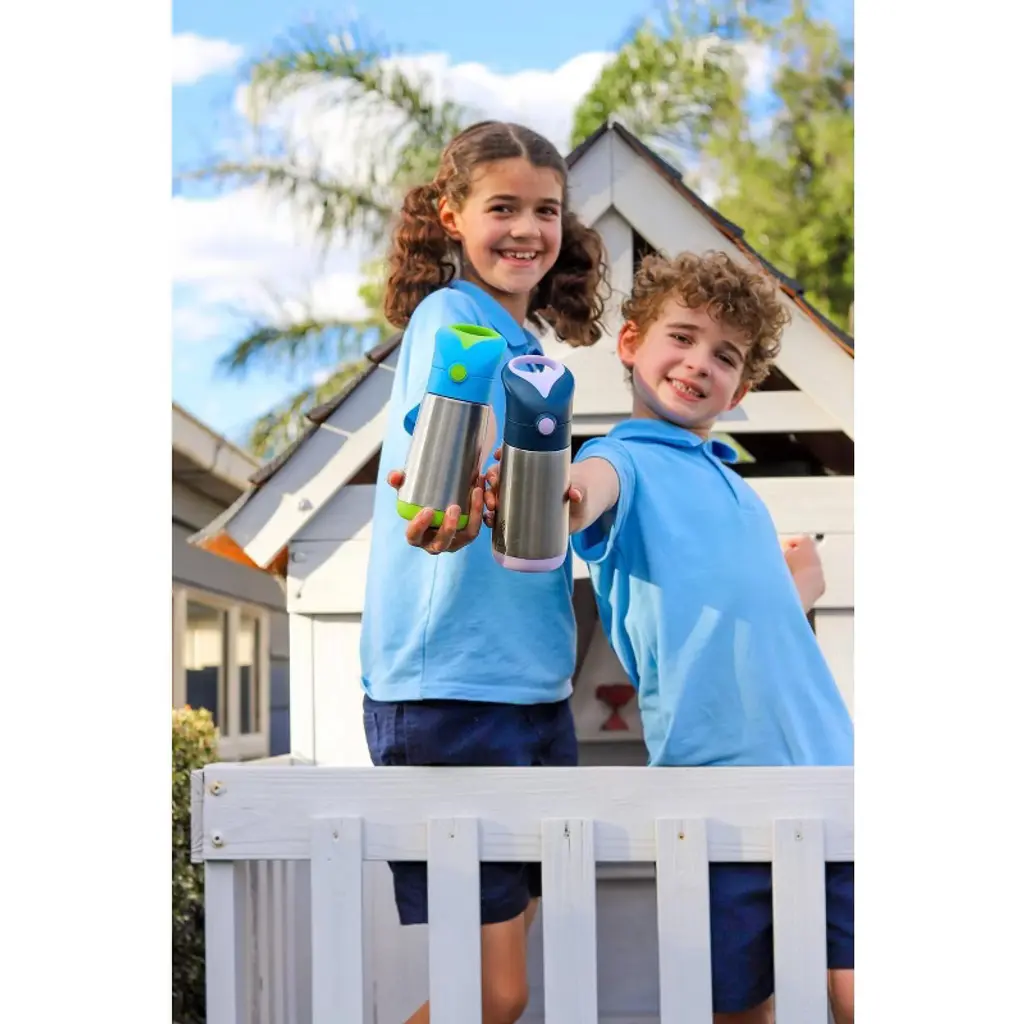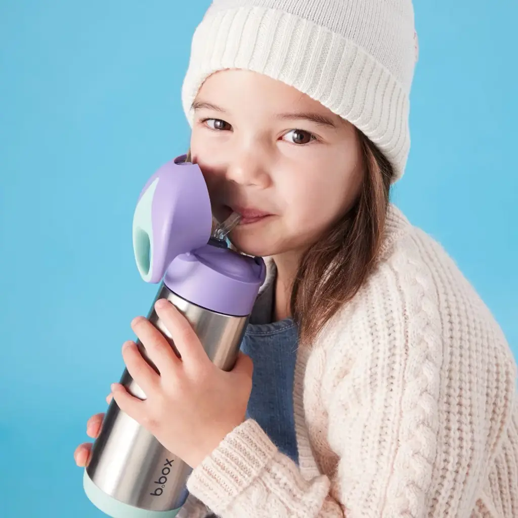 We've redefined cool with our insulated drink bottle. The triple walled stainless steel keeps liquids cool for up to 8 hours and warm for up to 6, so now kids can stay hydrated and happy whatever the weather. The silicone straw top offers free flow drinking, while the wide opening makes for super easy cleaning and filling with water or ice. Lid features an easy push button for smaller hands, keeping the straw covered and clean when not in use. Large carrying handle, so that hands big and small have an easy time carrying their favorite drinks around wherever they go! Made from stainless steel, polypropylene, and silicone - no BPA, phthalates, or PVC! 16-ounce volume.