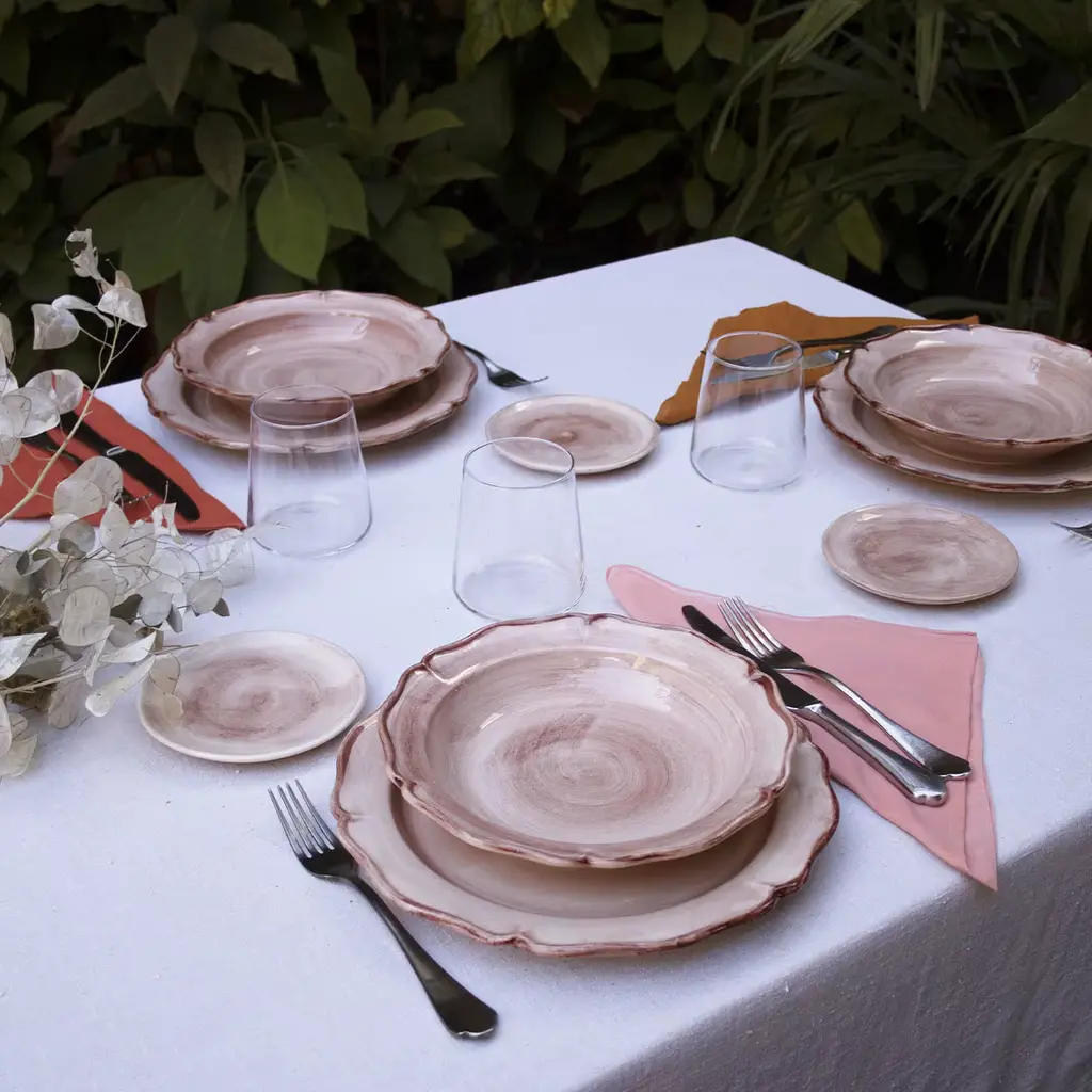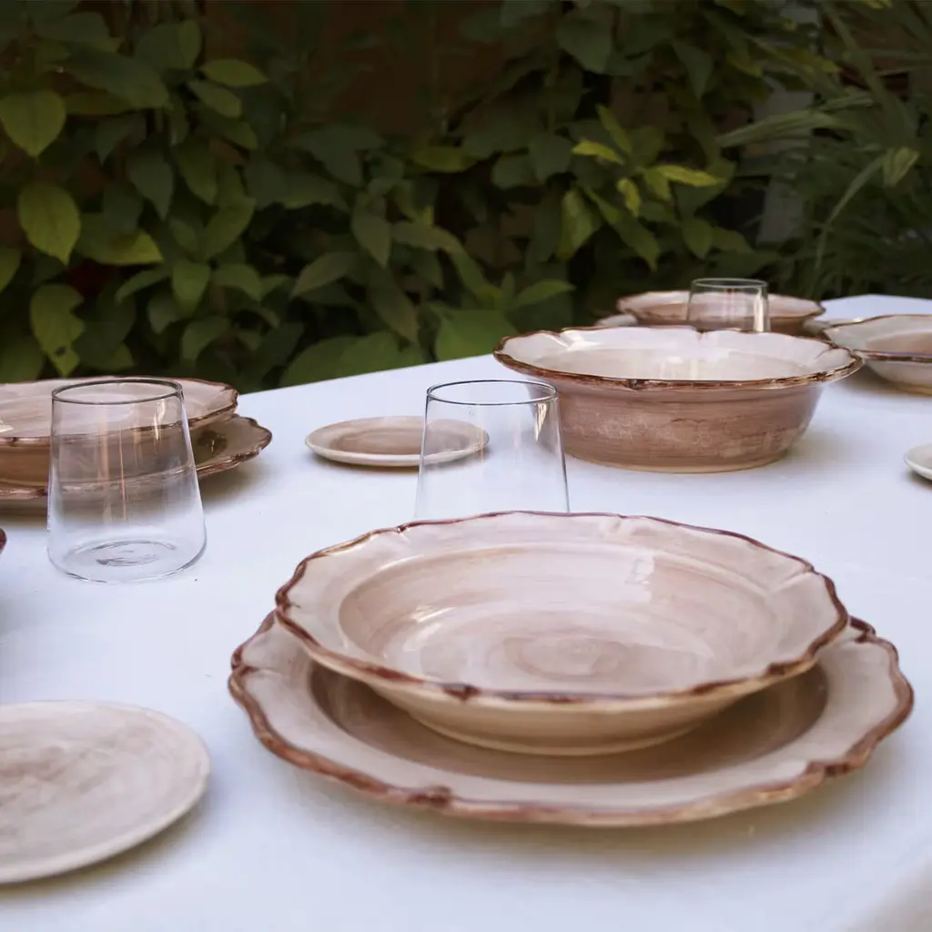 A sincere earthy tone distinguishes this sophisticated dinner plate from the Babi Collection. Decorated with manual brushstrokes using a brick-red oxide, the plate stands out for its warm and refined coloring deepened along the scalloped rim, which reveals the design's classic inspiration. Ideally combined with its soup and fruit counterparts available in the Artemest catalog.