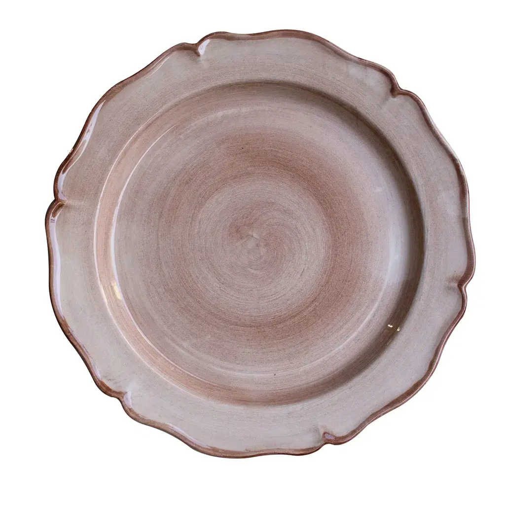 Perfect for serving salad or pasta on refined rustic-chic tables, this serving bowl is a singular ceramic piece where classic and modern references seamlessly merge. A dark brick-red tone accents the scalloped rim, while the rest of the plate flaunts a delicate brown hue enhanced by a glossy finish. Please explore the entire Babi Collection in the Artemest catalog.
