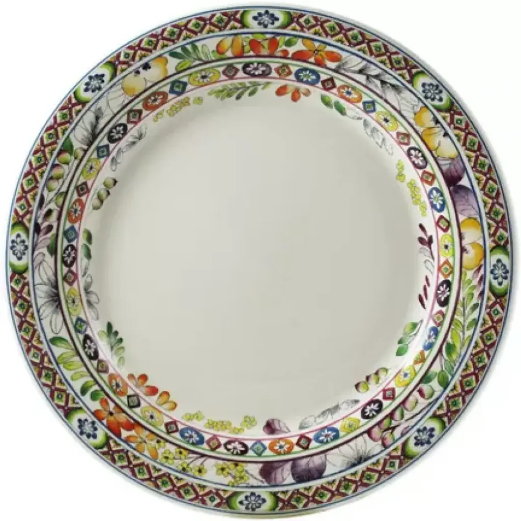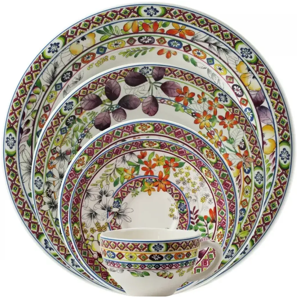 Gien's Bagatelle dinnerware is rimmed with colorful summer blooms in purple, orange, and gold. Designed by Agathe Charlot, the florals were inspired by the famous Bagatelle gardens, while the geometric borders were inspired by exotic Kilim rugs. Faience earthenware made in France by Gien. Four-piece place setting includes dinner plate, dessert plate, bowl, and mug. Five-piece place setting includes dinner plate, dessert plate, canape plate, US tea cup, and saucer. Located near the Loire Valley castles, the Faïencerie de Gien has been synonymous with prestigious faience tableware and decorative objects since its founding in 1821. Gien pieces are renowned for their warm white clays decorated with traditional motifs reminiscent of the French countryside.
