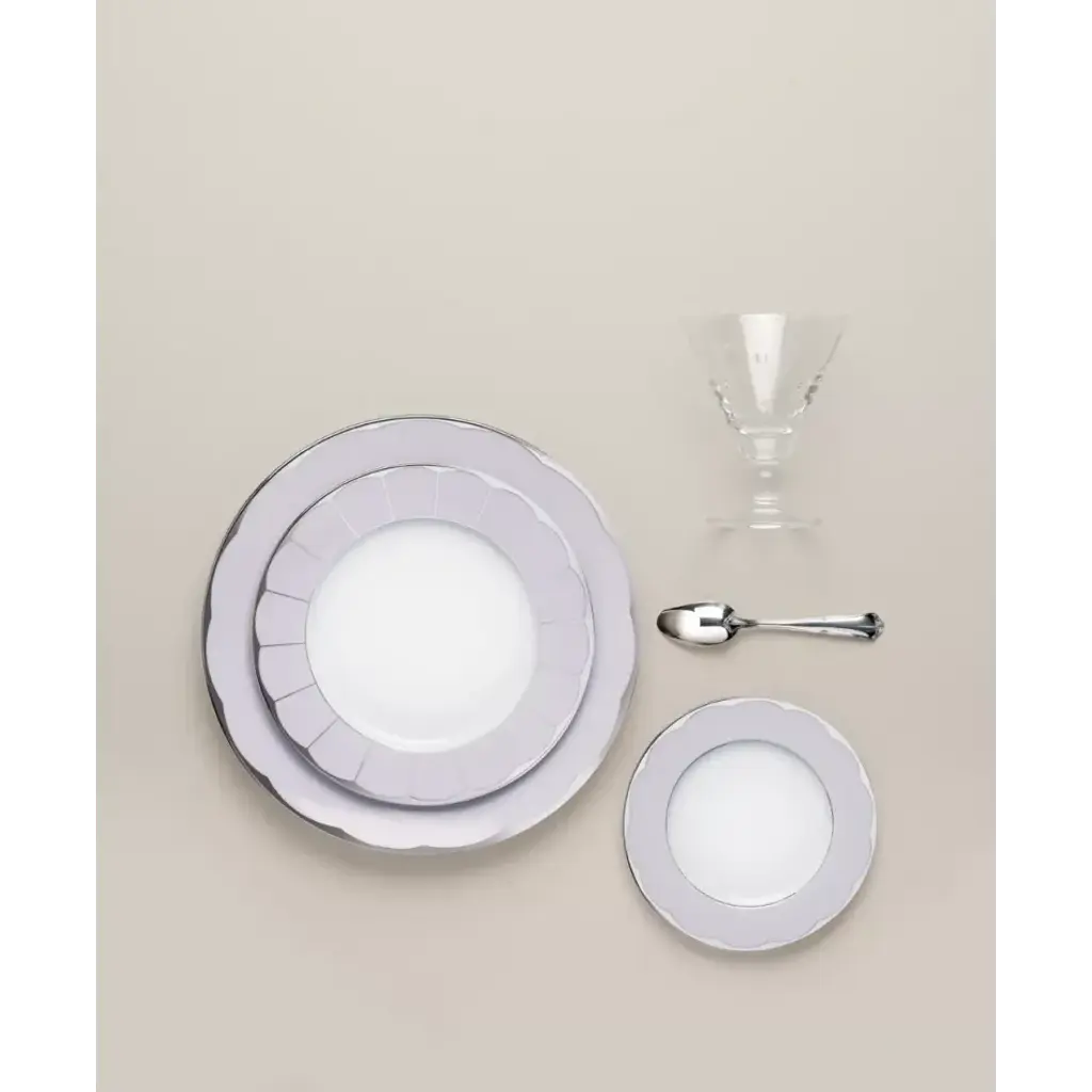 Designed by Barbara Barry for Haviland, the Illusion dinnerware collection features wide bands of color on a background of white Limoges porcelain. Each piece is accented with a thin band of gold. Five piece place setting includes dinner plate, dessert plate, bread & butter plate, teacup & saucer. Haviland Porcelain was founded by David Haviland, an American who moved from New York to France after he was brought a broken tea cup to match and recognized the quality and color of the old piece of porcelain. Filled with curiosity, he went to France to find the factory where the cup had been made, but the samples he was sent were not up to his standards. So in 1841, he moved to Limoges to set up his own factory. Traditional French dinnerware was usually produced in Limoges and sent to Paris for decoration. Haviland insisted on setting up a studio within his factory to have more control over the designs. Renowned artists, including Cocteau, Dali, and Kandinsky have played a role in the company's designs. Today, Haviland is one of the premier names in French porcelain dinnerware, sought by collectors all over the world. Clients have included the White House, Empress Eugenie, General de Gaulle, Jacques Chirac, the Emperor of Japan, and the Royal Court of Morocco.
