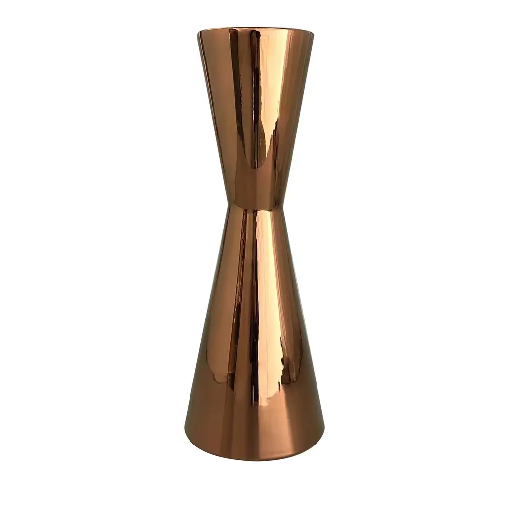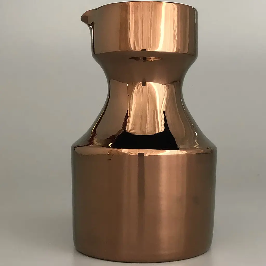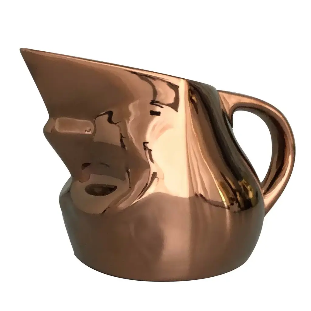 This ceramic carafe is inspired by 1970s Scandianvian minimalism. Handspun in white ceramic, the carafe is coated with white enamel and finished in glistening bronze by a soft-bristle brush before the third firing. The carafe is suitable for use with hot and cold drinks and can be personalized with horizontal stripes and short sentences on the bottom.