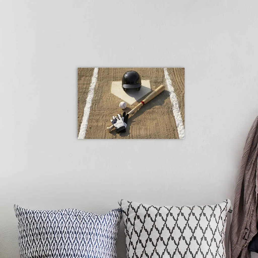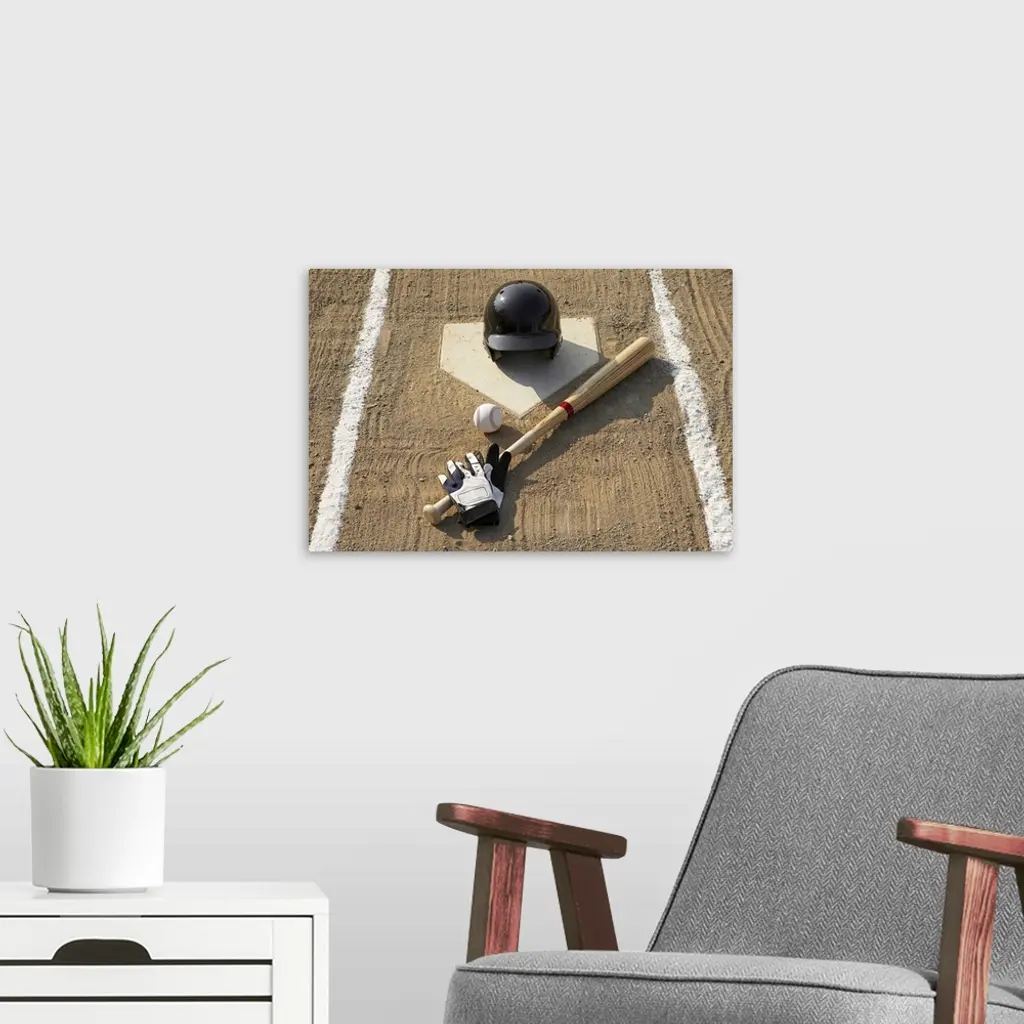 Baseball, bat, batting gloves and baseball helmet at home plate