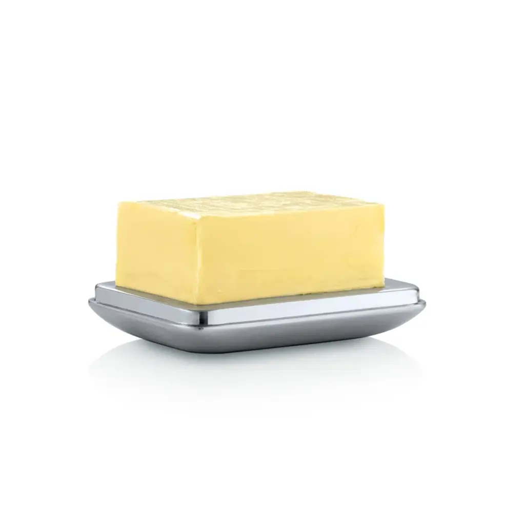 Indestructible dining. Crafted from stainless steel with a bright brushed finish, this durable butter dish serves up an ultramodern look. It’s sized for half a stick – ideal if you like to keep a little butter at room temp and store the rest in the fridge. Dishwasher safe; do not microwave.