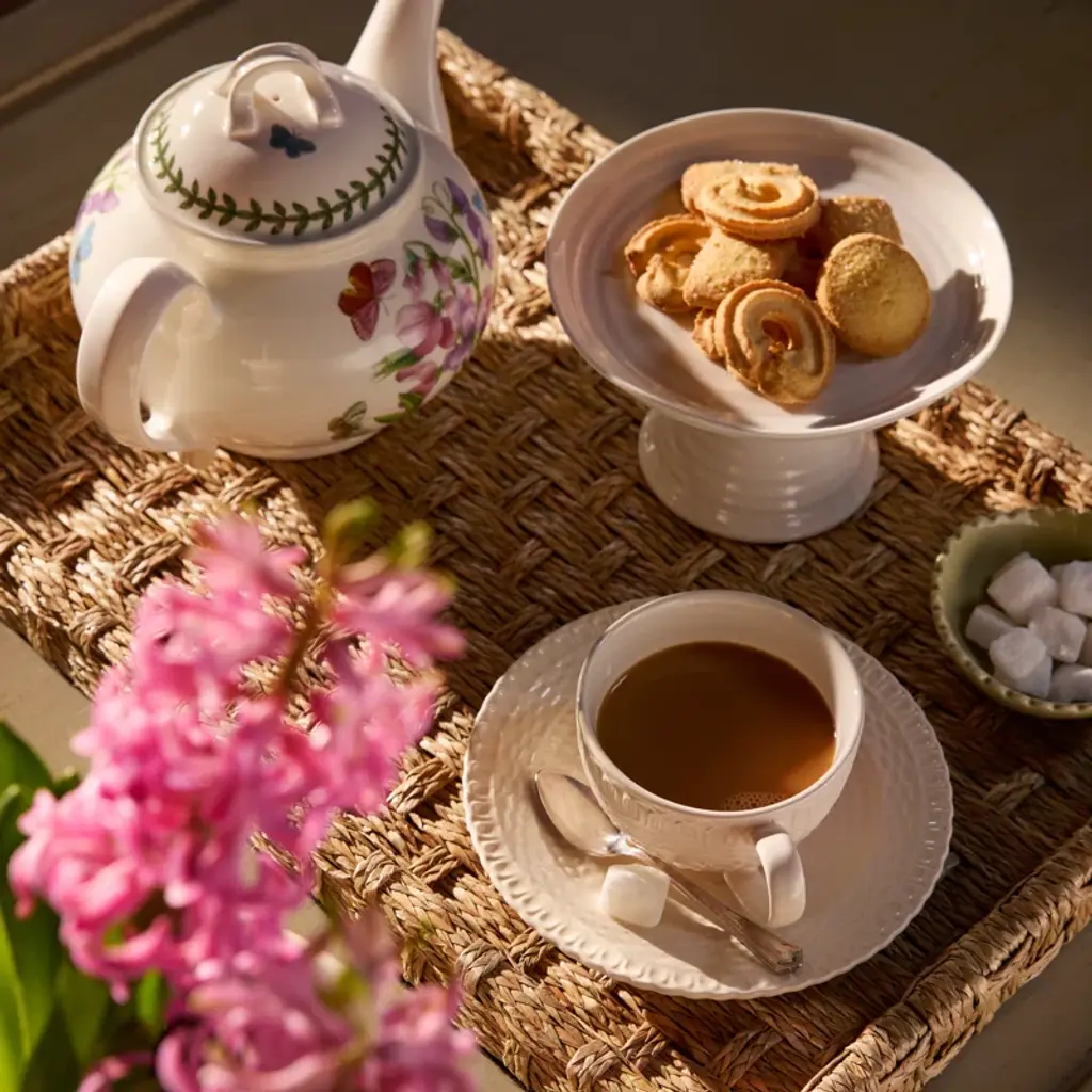 This creamware basketweave cup and saucer features a beautiful embossed pattern and neutral hue.