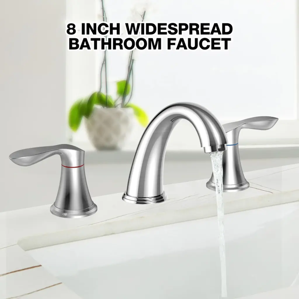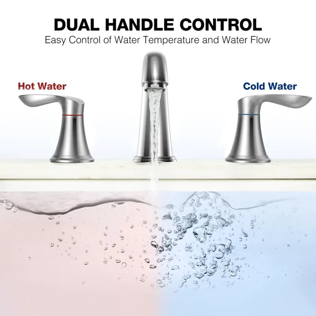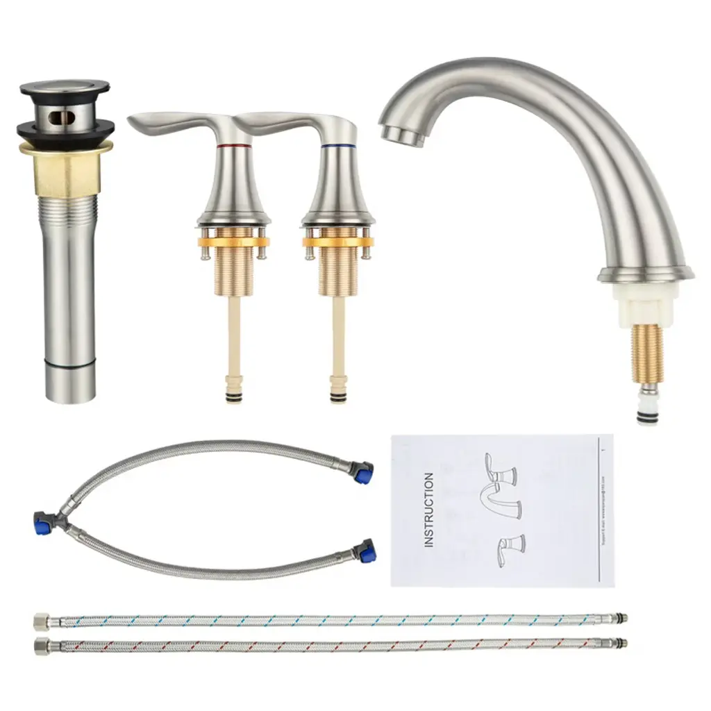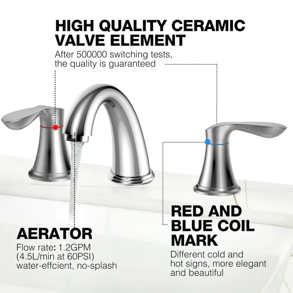 1.Premium Ceramic Valve: Tested for Durability & Leak-Proof Performance At the core of this bathroom faucet lies a top-tier branded ceramic valve, rigorously tested through over 500,000 switching cycles to guarantee long-lasting reliability. With a maximum flow rate of 1.2 GPM, it balances water efficiency with consistent performance. The valve¡¯s robust design ensures 100% leak-proof operation, even under extreme temperature fluctuations¡ªfrom scalding hot to icy cold. Maintenance-free by nature, it eliminates the hassle of frequent repairs, making it a dependable choice for daily use. 2.Hassle-Free Quick Installation: No Plumber NeededDesigned for DIY convenience, this faucet features a specialized quick-connect hose system that simplifies setup. Its widespread design accommodates 3-hole sinks with an adjustable spread (6¨C12 inches), adapting to your sink¡¯s specific dimensions. A pre-installed rough-in valve eliminates the need for additional parts, while the "Y"-shaped quick-connect mixer hose allows easy connection of the three separate components. Whether you¡¯re a seasoned DIYer or new to home projects, you can have it installed in minutes¡ªno professional plumber required. 3.Classic Elegance with Functional DesignThis two-handle faucet blends timeless style with practicality. The handles offer precise control over water flow and temperature, with red and blue rubber rings for easy hot/cold distinction¡ªpreventing accidental scalds. Finished in sleek brushed nickel (with optional brushed gold), it adds a touch of sophistication to any bathroom, complementing modern, traditional, or transitional decor. Its clean lines and understated luxury make it a focal point that elevates your sink area. 4.Certified Safety & Quality MaterialsCommitted to safety, this faucet meets strict CEC, cUPC, and NSF certifications, ensuring compliance with industry standards for water efficiency and material safety. Crafted with copper pipes, it guarantees clean, safe water by resisting corrosion and preventing contaminants from leaching into the water supply. Whether for family bathrooms or guest spaces, it prioritizes both performance and peace of mind. 5.Reliable Customer SupportBacked by a dedicated service team, we stand behind the quality of our faucet. If you encounter any issues¡ªfrom installation questions to part concerns¡ªour team responds promptly to resolve problems, ensuring your satisfaction. With a focus on customer care, we make sure your experience with the product is as smooth as its operation.