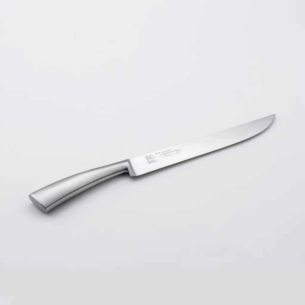 Does it slice cleanly through roasts? Yes—the 9-inch stainless steel blade is long, narrow, and steady enough for even cuts. Part of the BE–Knife line designed by KNIndustrie with Coltelleria Berti, this carving knife is forged from a single piece of brushed stainless steel with a frosted finish. The squared bolster transitions into a slim, tapering handle that feels secure in hand, whether you’re carving at the table or slicing in the kitchen. At 9″ long and 9.87 oz (0.28 kg), the blade carries enough weight for smooth motion but keeps a fine edge for thin slices. Turkey, ham, or a roast beef—all part easily under its narrow profile, with less tearing and more control. Handmade in Italy. Wash by hand in warm water and towel-dry; avoid air-drying. Dishwasher safe, though hand care helps preserve sharpness.
