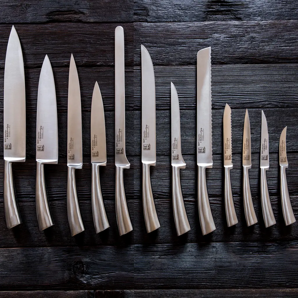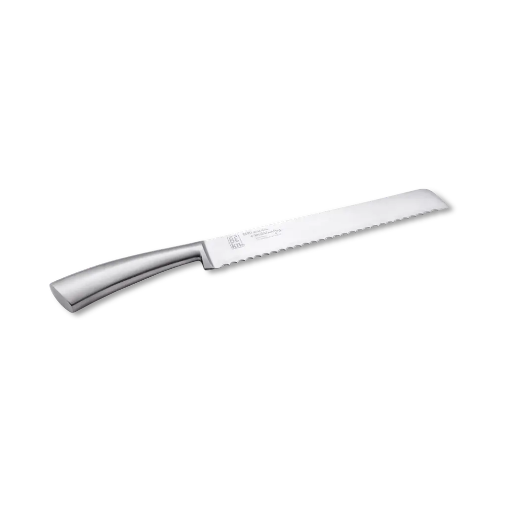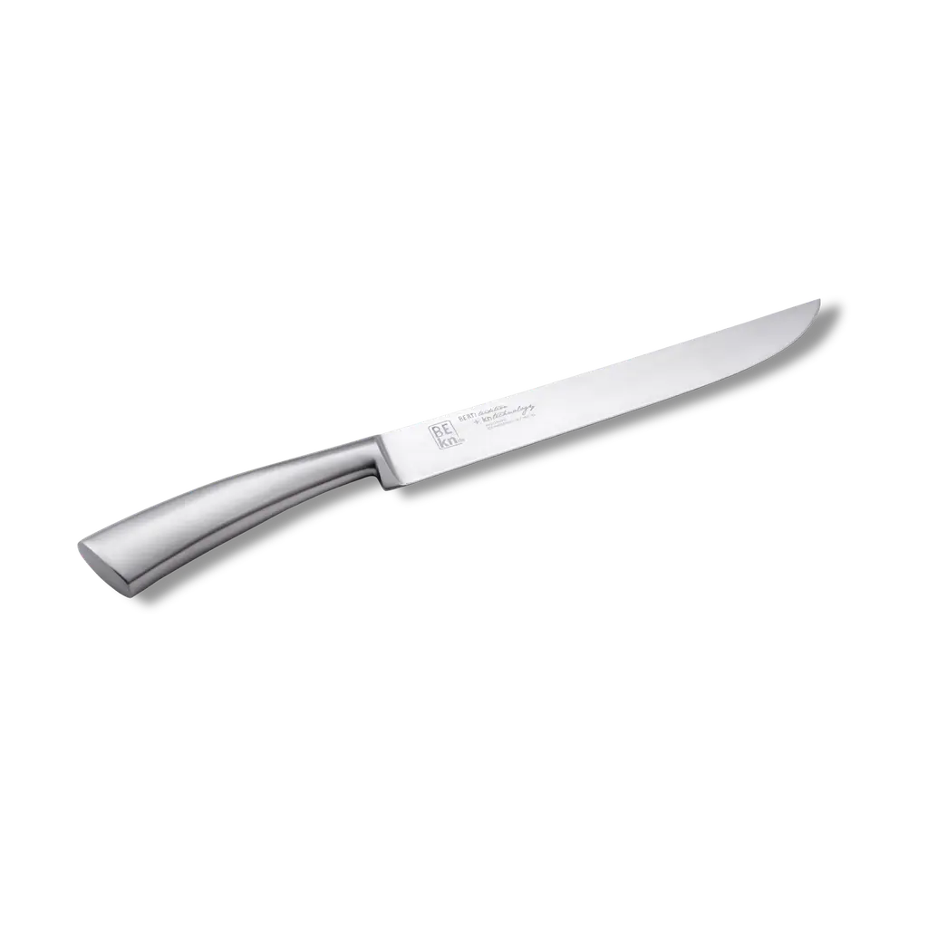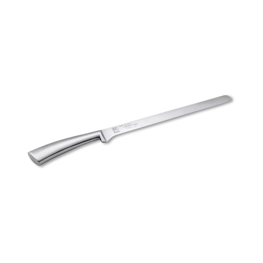 What’s the advantage of a slicer knife? A long, narrow blade that moves through meat and fish in smooth strokes, giving even slices instead of jagged cuts. The BE–Knife Slicer, from KNIndustrie’s collaboration with Coltelleria Berti, is forged from one piece of stainless steel with a frosted finish. The squared bolster offers a natural grip point, while the handle feels light but stable. At nearly 10 inches in length, the blade works best with a gentle draw—ideal for salmon, ham, or roasts. It’s slim enough to avoid tearing, long enough to carry a slice cleanly in one motion. The knife weighs about 9.8 oz (0.28 kg), giving it just enough heft to stay steady without slowing the cut. Handmade in Italy. Wash in warm water and dry with a towel; dishwasher safe, though handwashing is kinder to the edge.