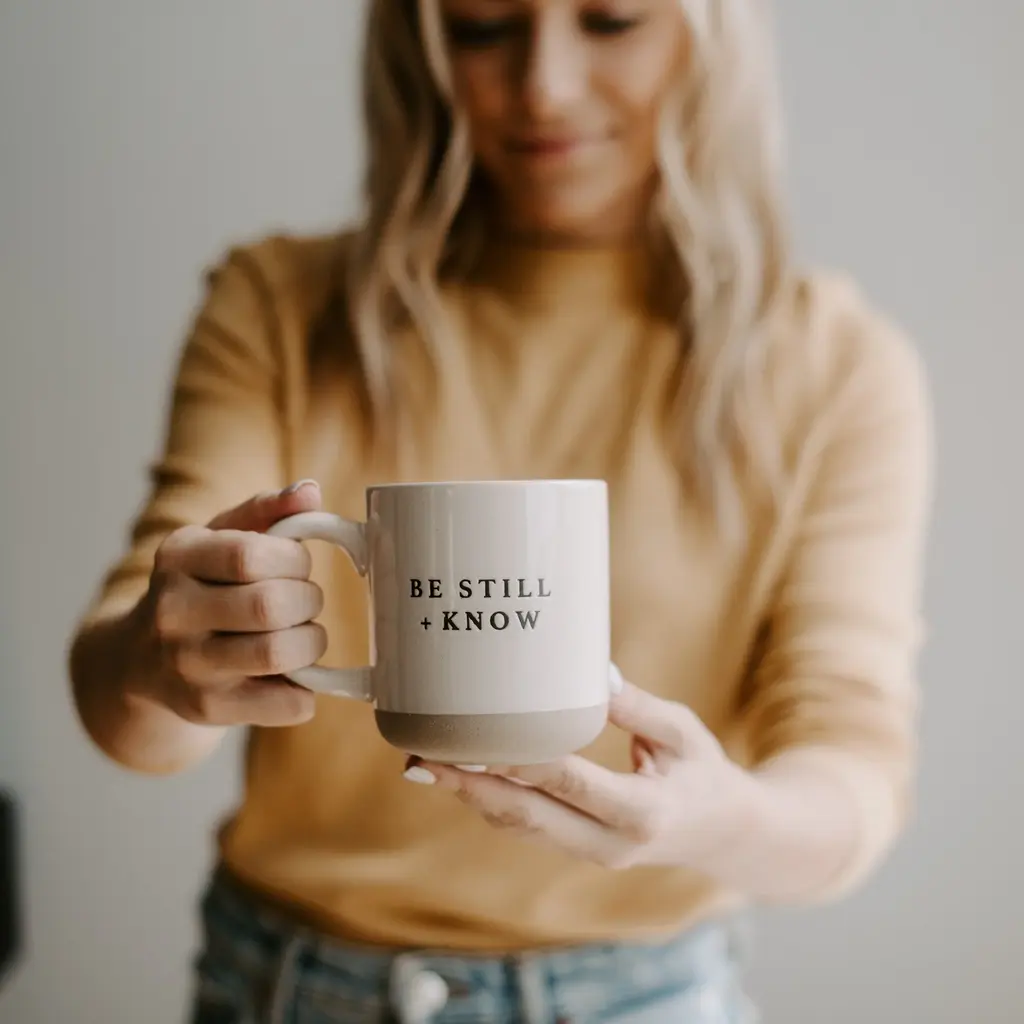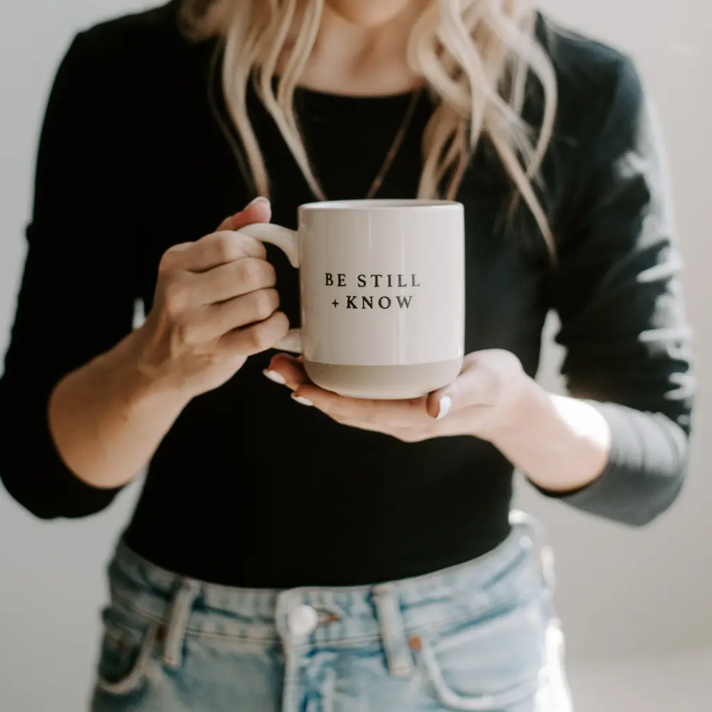 Get a calm start to your day with our Be Still + Know Stoneware Coffee Mug and gain the energy to tackle your busy day. Makes a great Christian gift for encouragement or Christmas, Mother's Day and every other holiday in between. Each piece is hand-crafted, making the character of each mug perfectly unique. There may be slight variations in each stoneware coffee mug. DETAILS: 14oz Stoneware Style Mug Size: 3.31 x 3.93" (5.19" w/handle) Original Design: Be Still and Know Design on Both Sides of Mug Cream With Black Lettering Speckled Design with Natural Bottom Details (Each is Perfectly Unique) Designed in the USA, Imported UPC: 00811119034073 | Style No. CM063 CARE: Dishwasher and Microwave Safe Wash Before Use and Avoid Abrasive Cloths When Cleaning Use Caution When Removing From Microwave <!-- td {border: 1px solid #ccc;}br {mso-data-placement:same-cell;} --> <!-- td {border: 1px solid #ccc;}br {mso-data-placement:same-cell;} -->