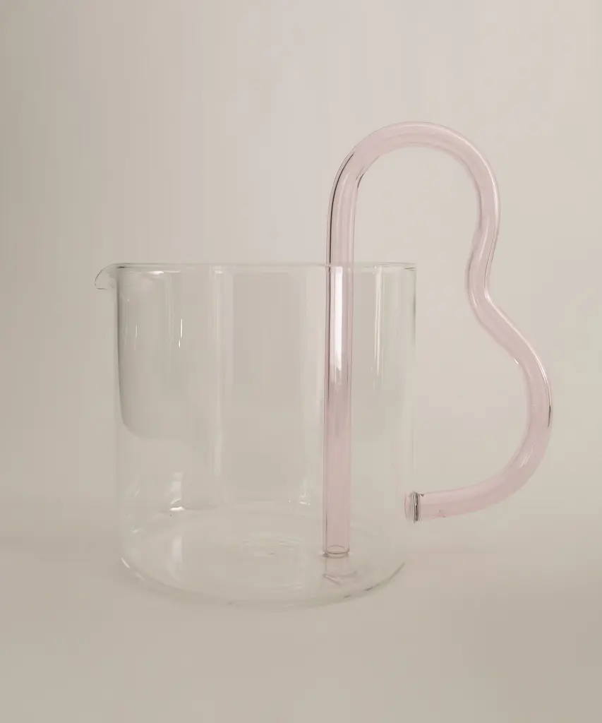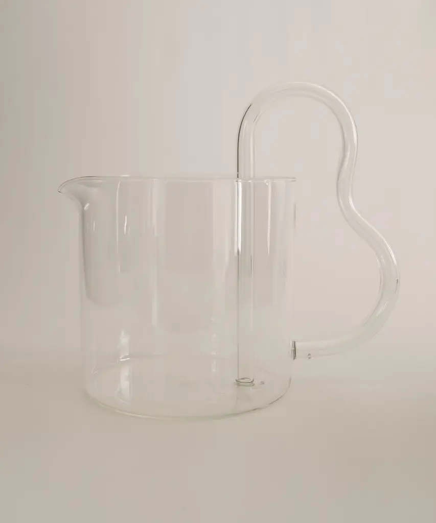 A borosilicate glass pitcher, for pouring water, juice, watering plants, holding flowers, or any other use you can think of. Designed by Sophie Lou Jacobsen, a French-American designer based in New York City.